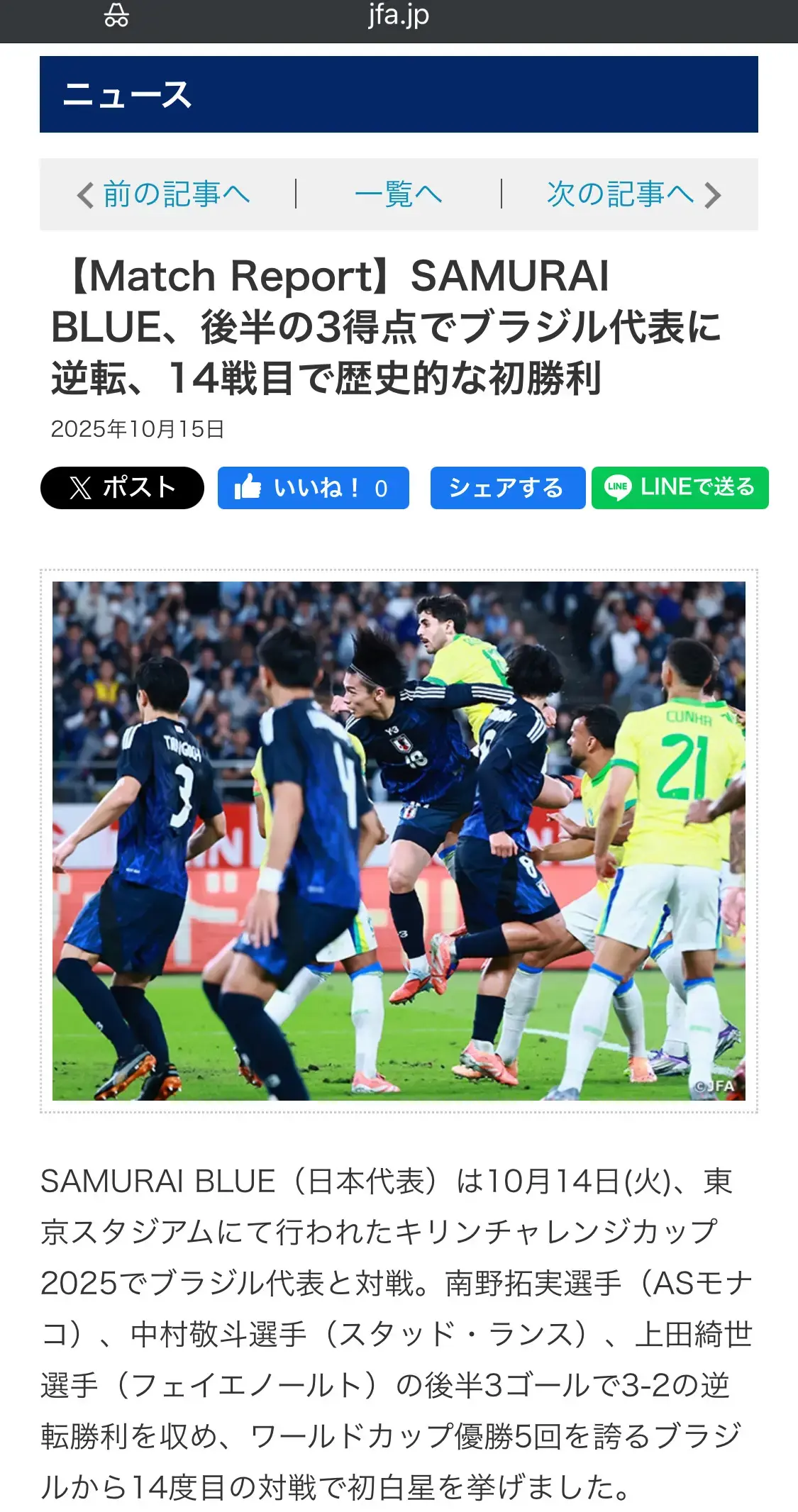 サッカー男子日本代表がブラジル代表相手に勝利を収めました。ワールドカップ優勝5回を誇るサッカー王国ブラジルとは、過去に13度対戦して一度も勝ったことがなかったわけですが。先日の試合では、初勝利となりました。おめでとうございます!