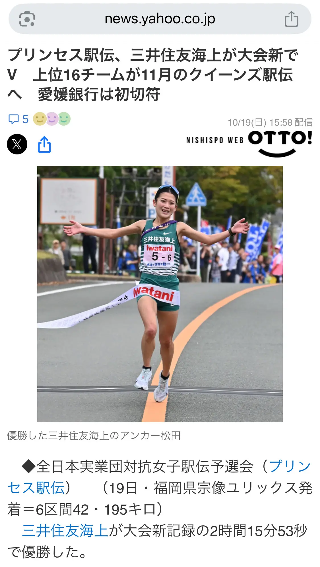 全日本実業団対抗女子駅伝競走大会予選会(プリンセス駅伝)が開催され、三井住友海上が大会新記録で優勝を飾りました。おめでとうございます(パチパチパチパチ)三井住友海上は、スーパールーキーの不破聖衣来選手を温存しての大会新記録での優勝ということで、クイーンズ駅伝でどこまでいけるかも期待がかかります。