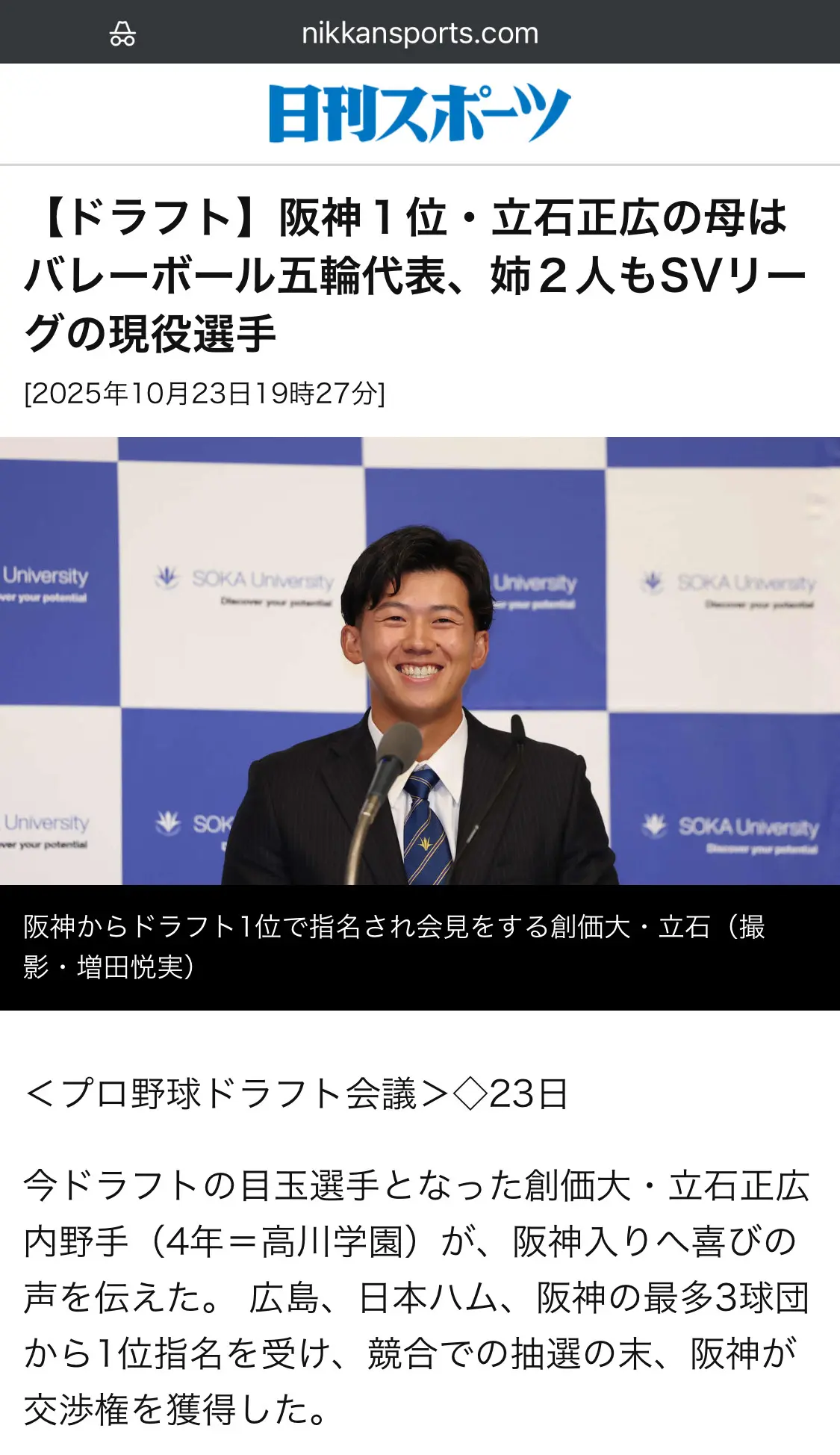 プロ野球ドラフト会議が開催され、最大の目玉といわれていた大学No.1スラッガーの立石正広選手(創価大学)の動向に注目が集まりました。大学No.1スラッガーの立石正広選手(創価大学)は、バレーボールの元日本代表でバルセロナ五輪で活躍した苗村選手を母に持ち、姉2人も現役のバレーボール選手という、実は、バレーボール一家で育った選手なのです。