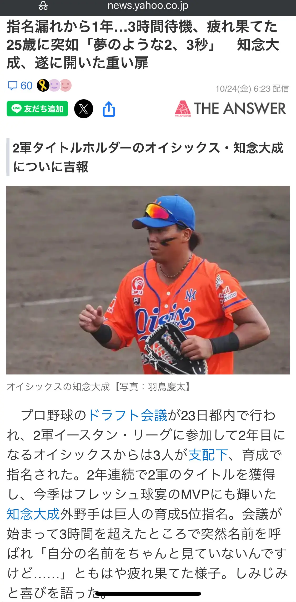 バレーボール一家で育った選手が、今回のドラフト会議最大の目玉となっていたわけです。前評判通りの人気で、最多の3球団から1位指名を受けました。抽選の結果、阪神タイガースへの入団が決定!今後の活躍に期待がかかります。そして、今回のドラフト会議で個人的に驚いたことは、読売ジャイアンツが、沖縄県出身の選手を3名も指名したことです。ドラフト3位で山城京平選手(興南高~亜細亜大)、ドラフト5位で小濱佑斗選手(中部商業高~沖縄電力)、育成5位で知念大成選手(南城市立玉城中~沖縄尚学高~沖縄電力~オイシックス)の3人です。知念大成選手は、ぜひ支配下登録を勝ち取って、一軍で活躍する姿をみたいですな。