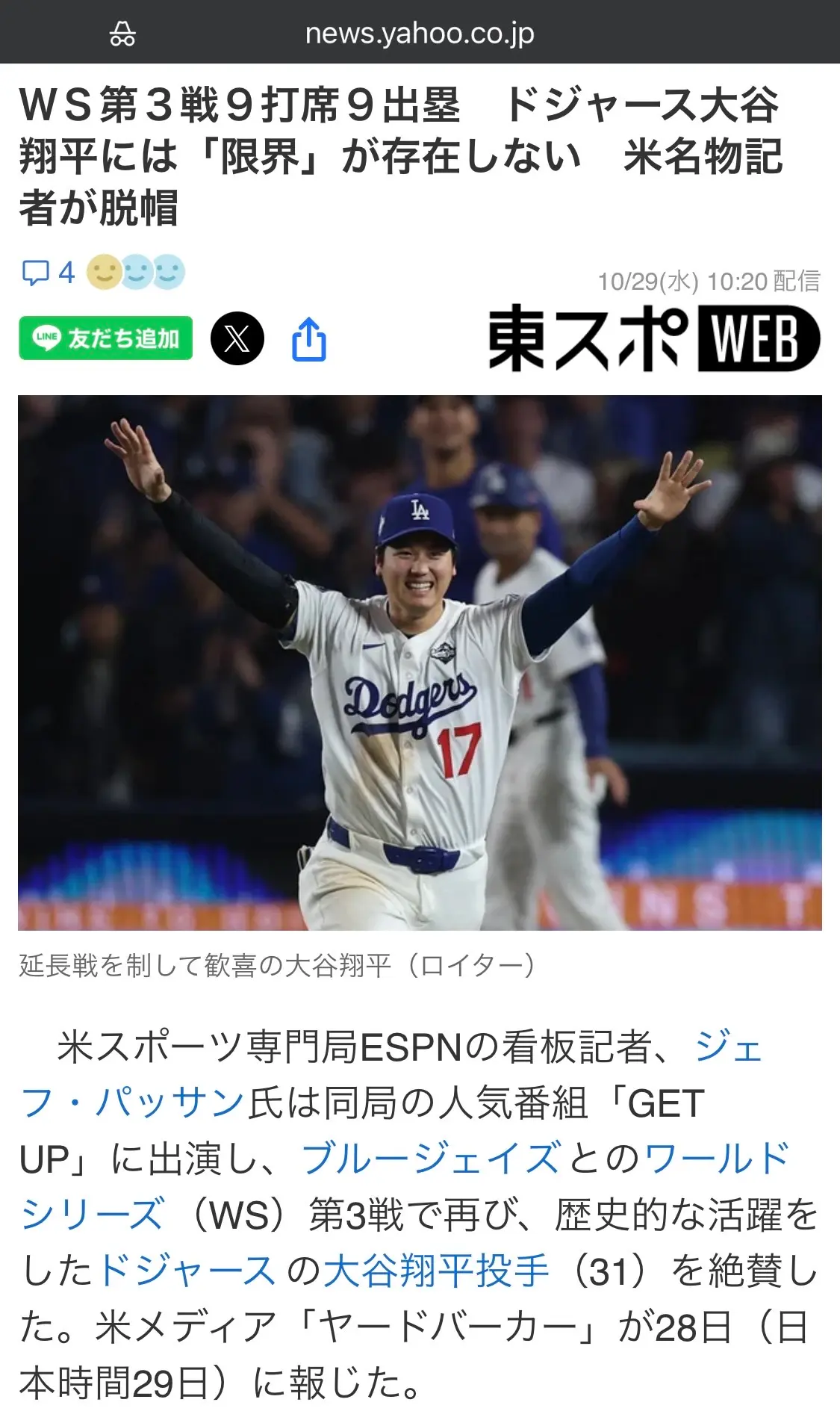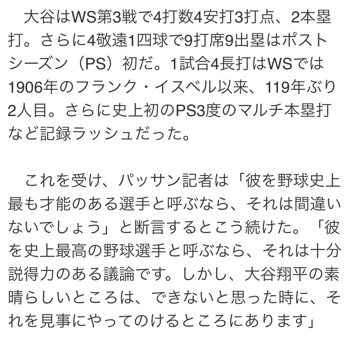 野球のワールドシリーズ第3戦で、ドジャースの大谷翔平選手が、4打数4安打(内2本ホームラン)4敬遠1四球で、9打席9出塁になったとのこと。これ、1試合での成績ですよ。1試合の中で4敬遠1四球って、、、どれだけ恐れられているんだ、、、世界の野球の歴史の中で1番の選手なのでは・・・