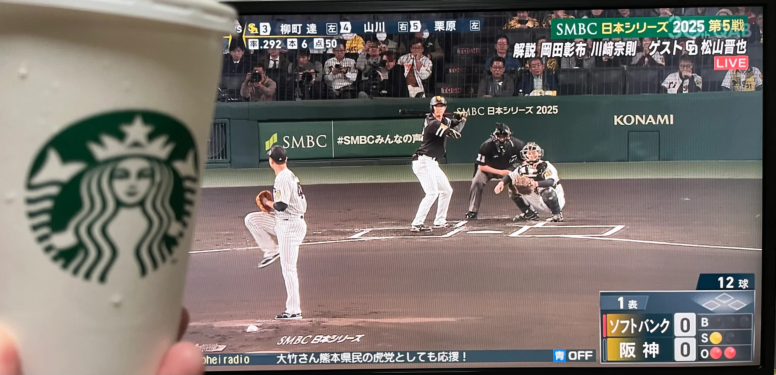 スターバックスコーヒーを片手に、プロ野球の日本シリーズ第5戦をみていました。パリーグ王者の福岡ソフトバンクホークス VS セリーグ王者の阪神タイガースの対戦です。今日で優勝が決まる可能性があるので、どうしても見たかったのです。