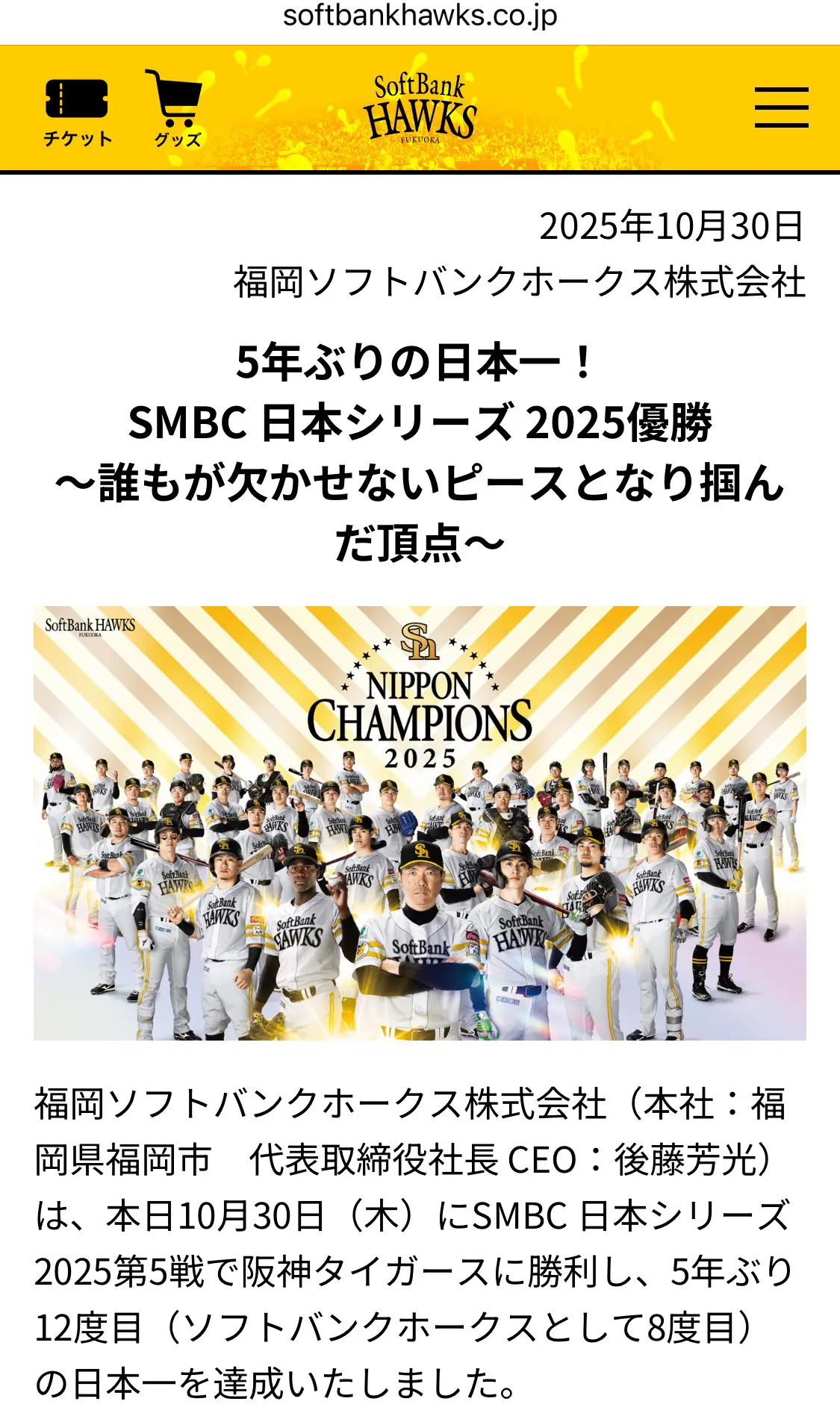 結果は、福岡ソフトバンクホークスの勝利で、優勝を飾りました。おめでとうございます!今シーズンは、序盤最下位に沈むなど苦戦をしいられましたが。見事に巻き返しての優勝となりました。やっぱり、最強のホークスは、強いですな。