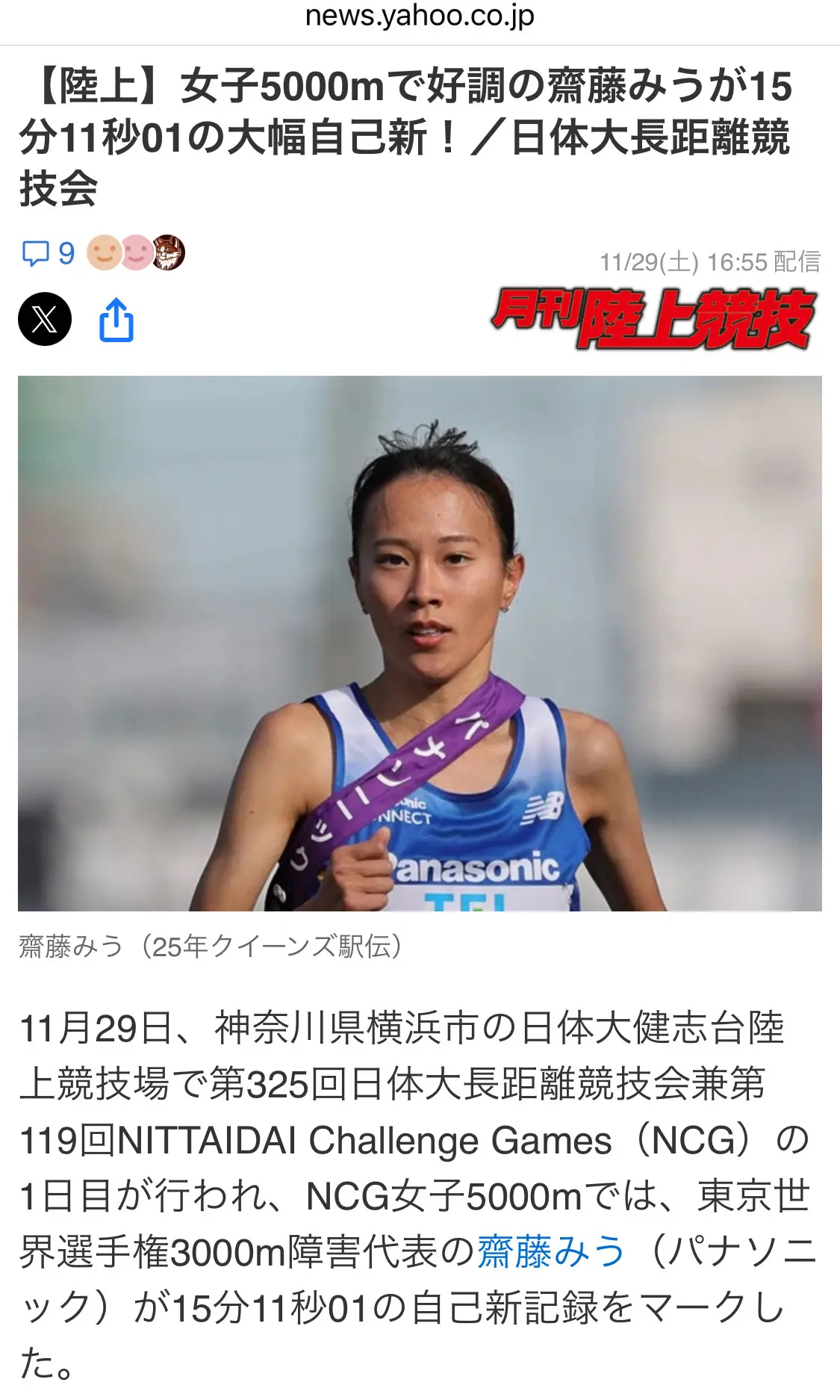 今日は、日本体育大学長距離競技会も開催され、パナソニックの齋藤みう選手(女子3000m障害の日本記録保持者)が、5000mで大幅自己新記録というのが世間を騒がせました。