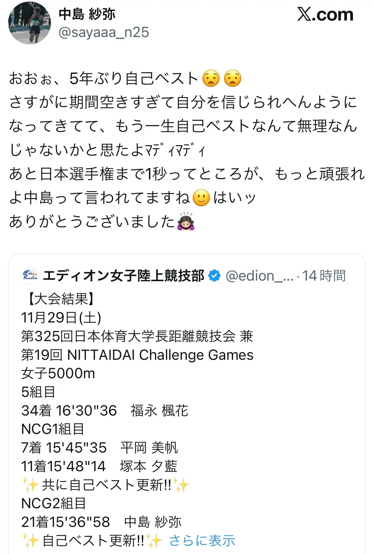 そして、先日の全日本実業団女子駅伝(クイーンズ駅伝)を制したエディオンの中島紗弥選手(鹿屋体育大学時代に日本インカレ5000m優勝の実力者)も自己ベストを更新!!本当におめでとうございます(パチパチパチパチ)