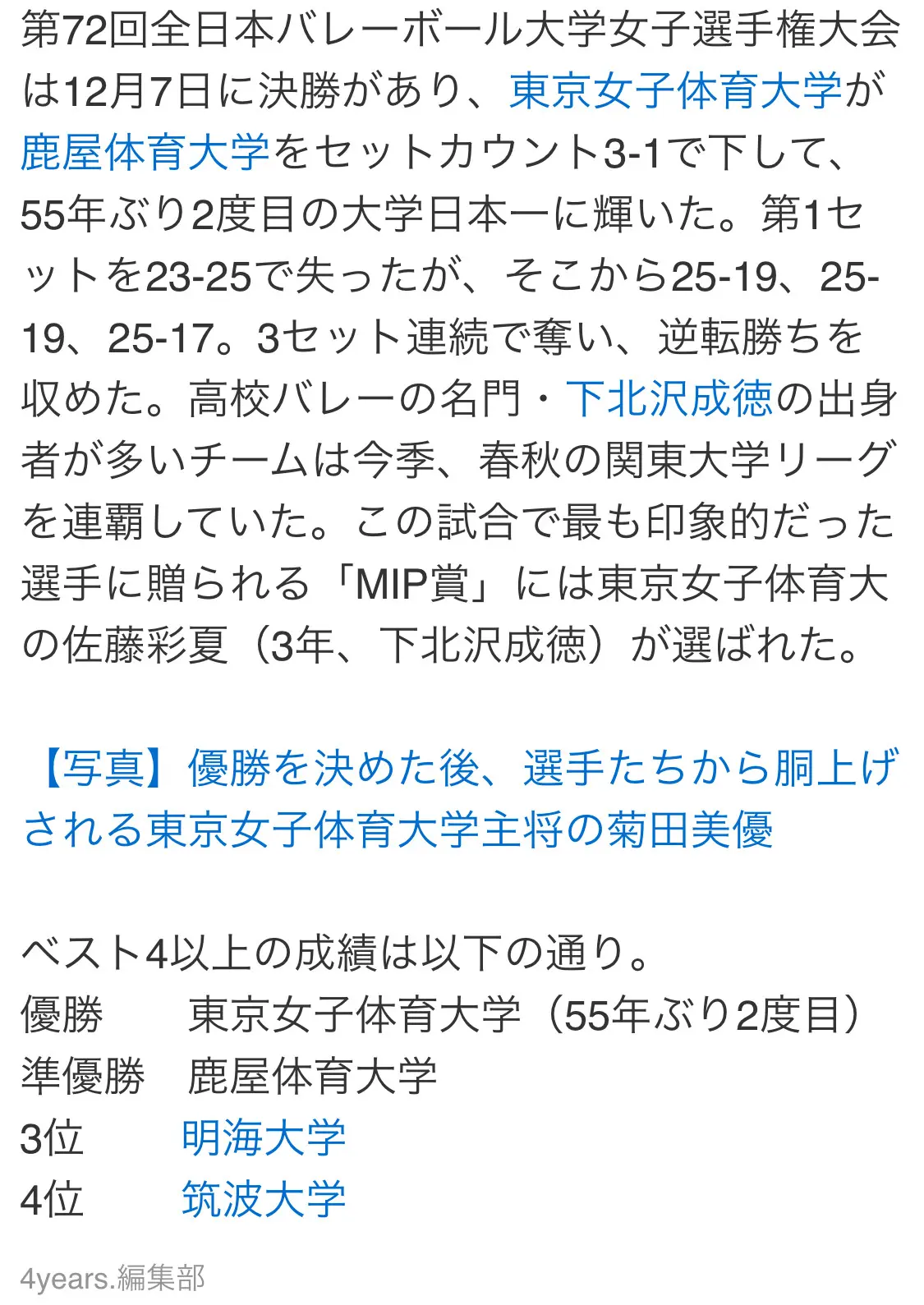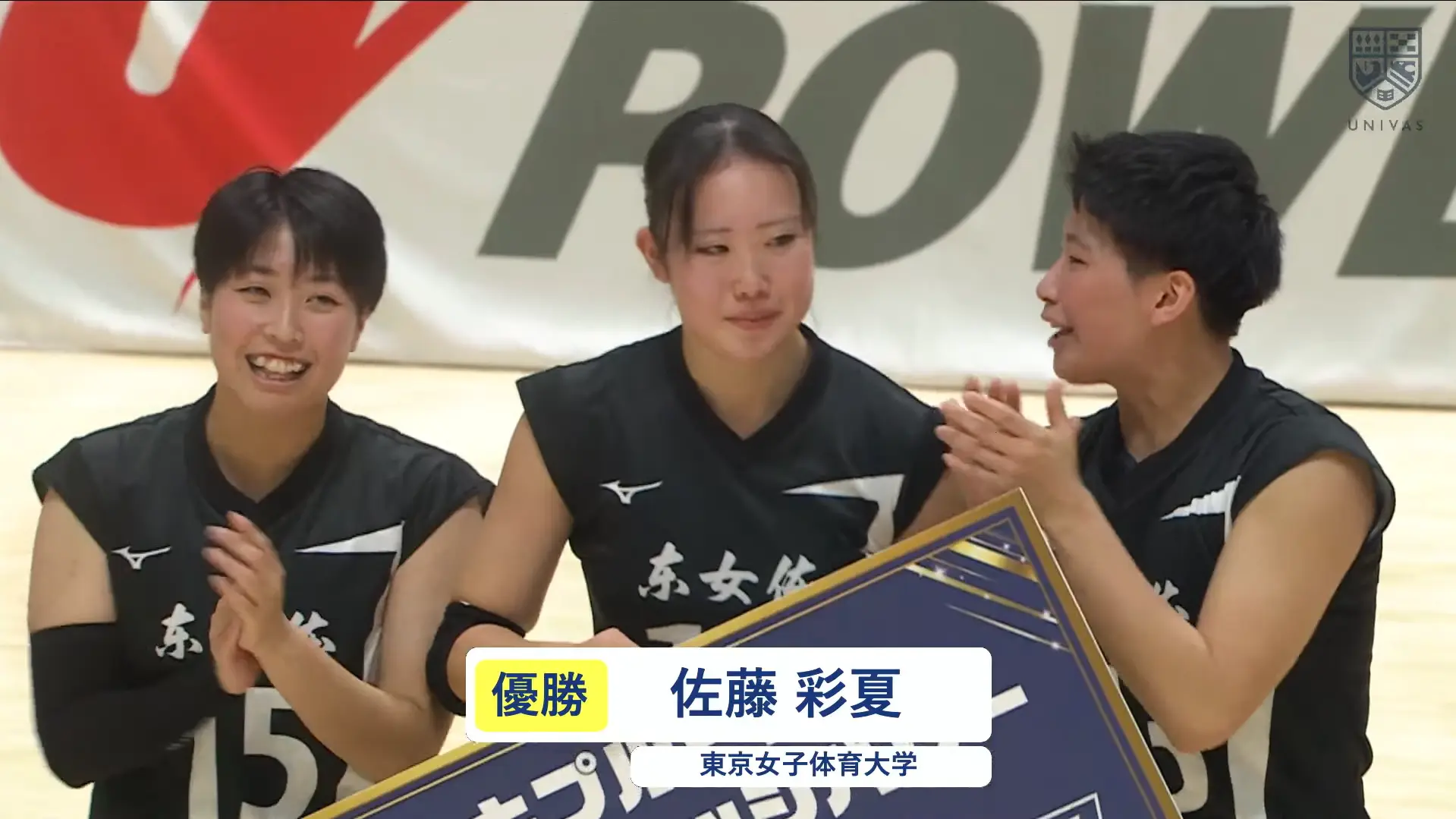 東京女子体育大学の背番号14、佐藤彩夏選手(下北沢成徳高校卒)が大活躍しまして。佐藤彩夏選手にボールを集めれば決まるみたいな流れになってしまい。最後まで、佐藤彩夏選手への対応策がみつからずに終わってしまった印象です、、、やはり、一人、スーパーエースがいるだけでバレーボールは違いますな。東京女子体育大学、優勝おめでとうございます(パチパチパチパチ)