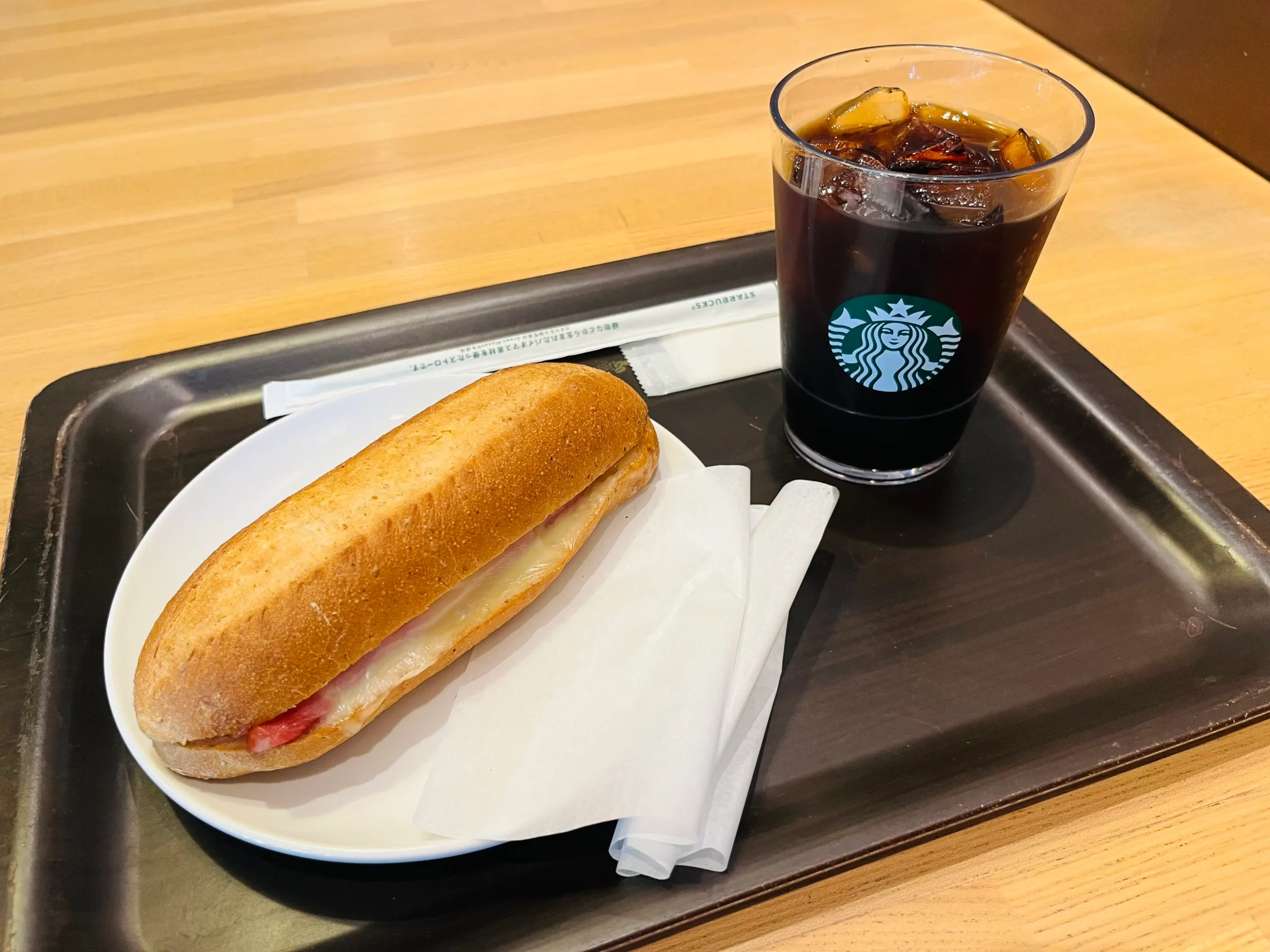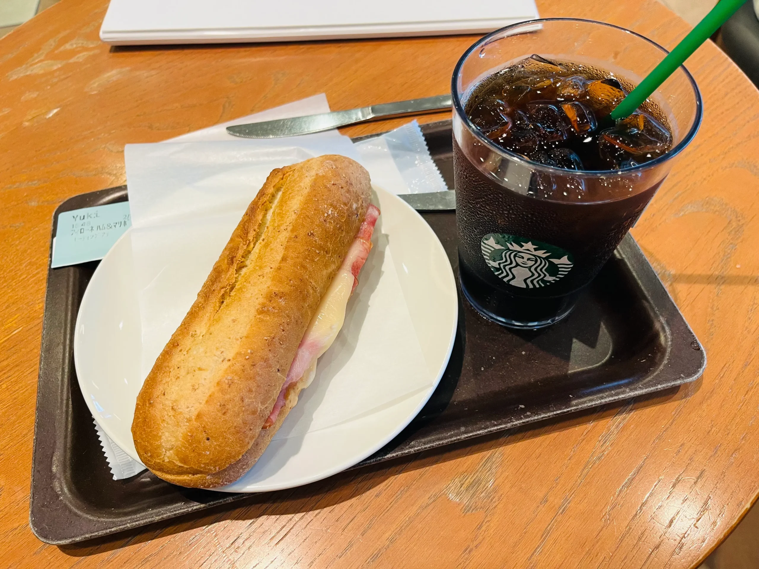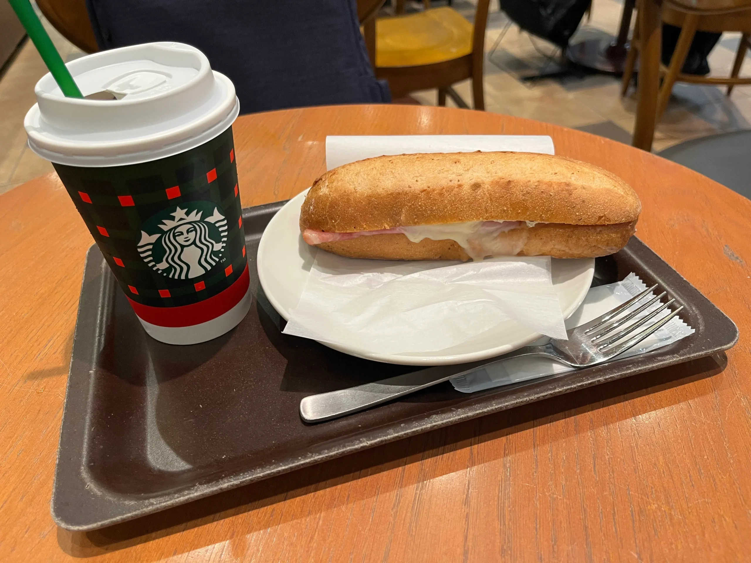 出張パーソナルトレーニングの合間に、スターバックスに寄ったのですが。ハム&マリボーチーズ石窯フィローネにナイフをつけてもらったの、初めて?かも。