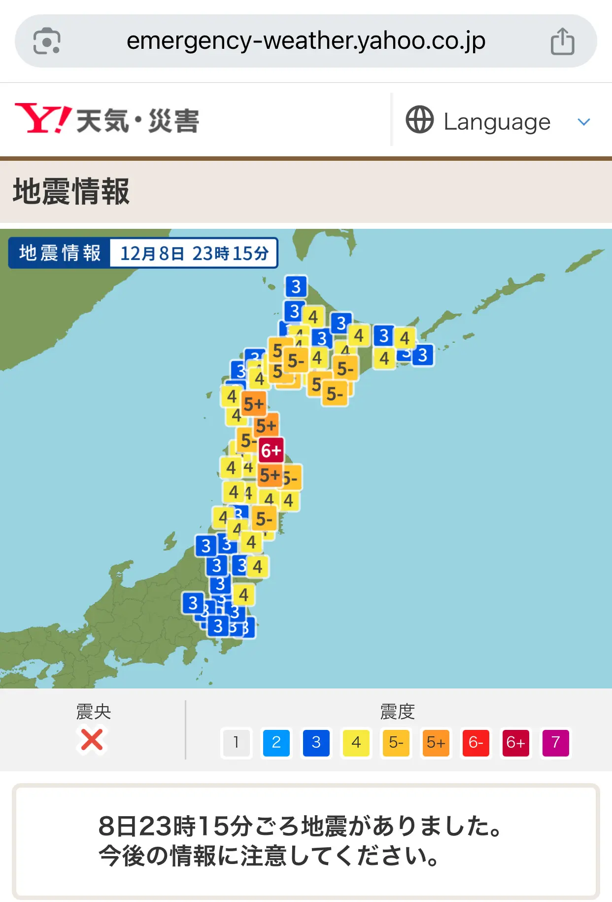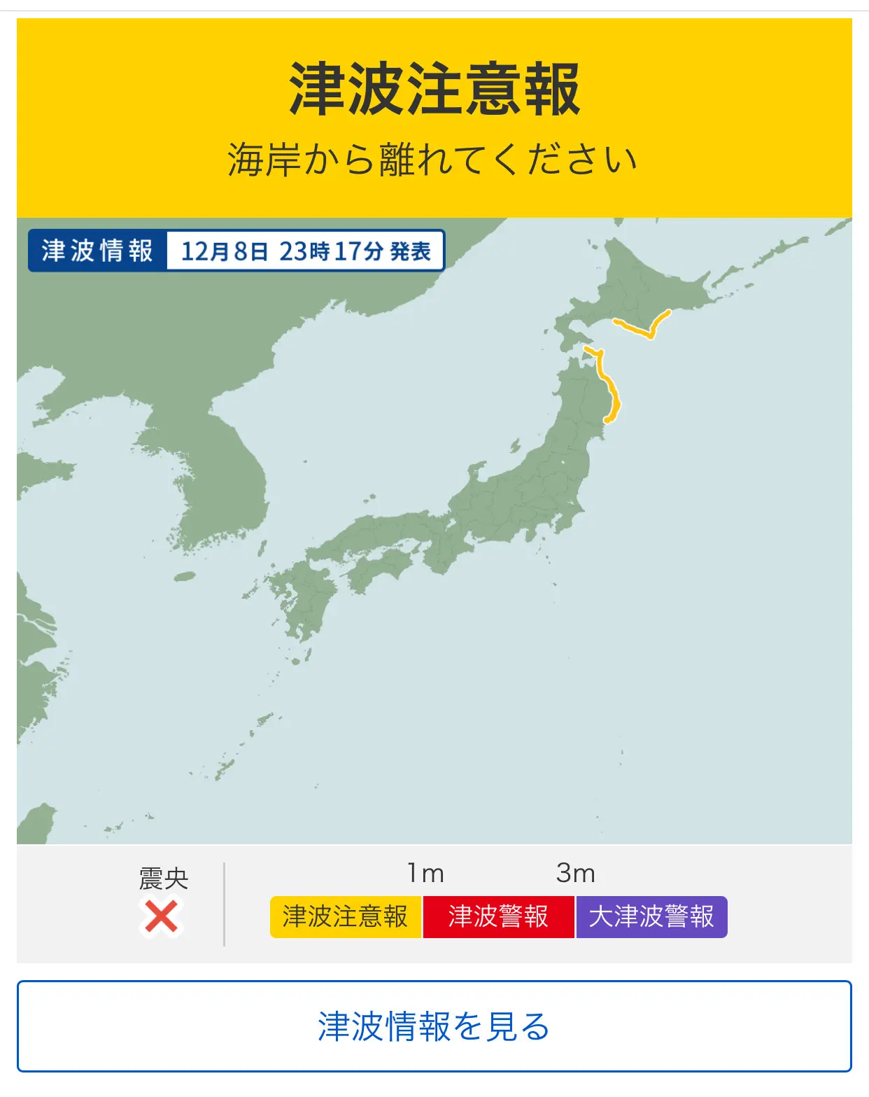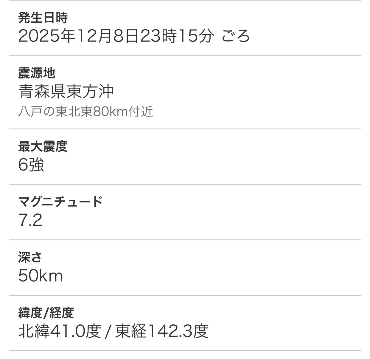23時15分に、震度6強、マグニチュード7.2、深さ50kmの強い地震があったみたいですね。。。津波も心配です。