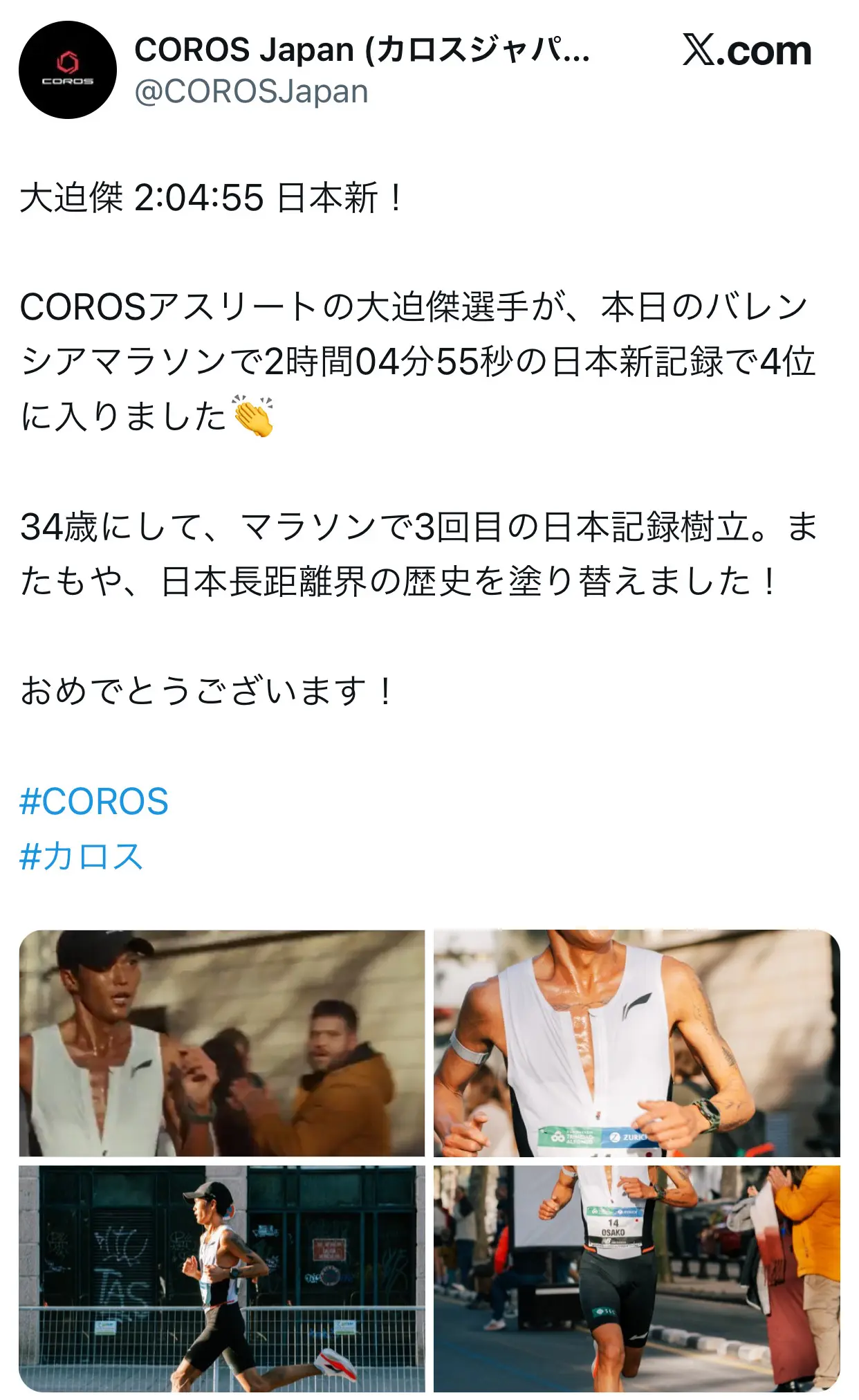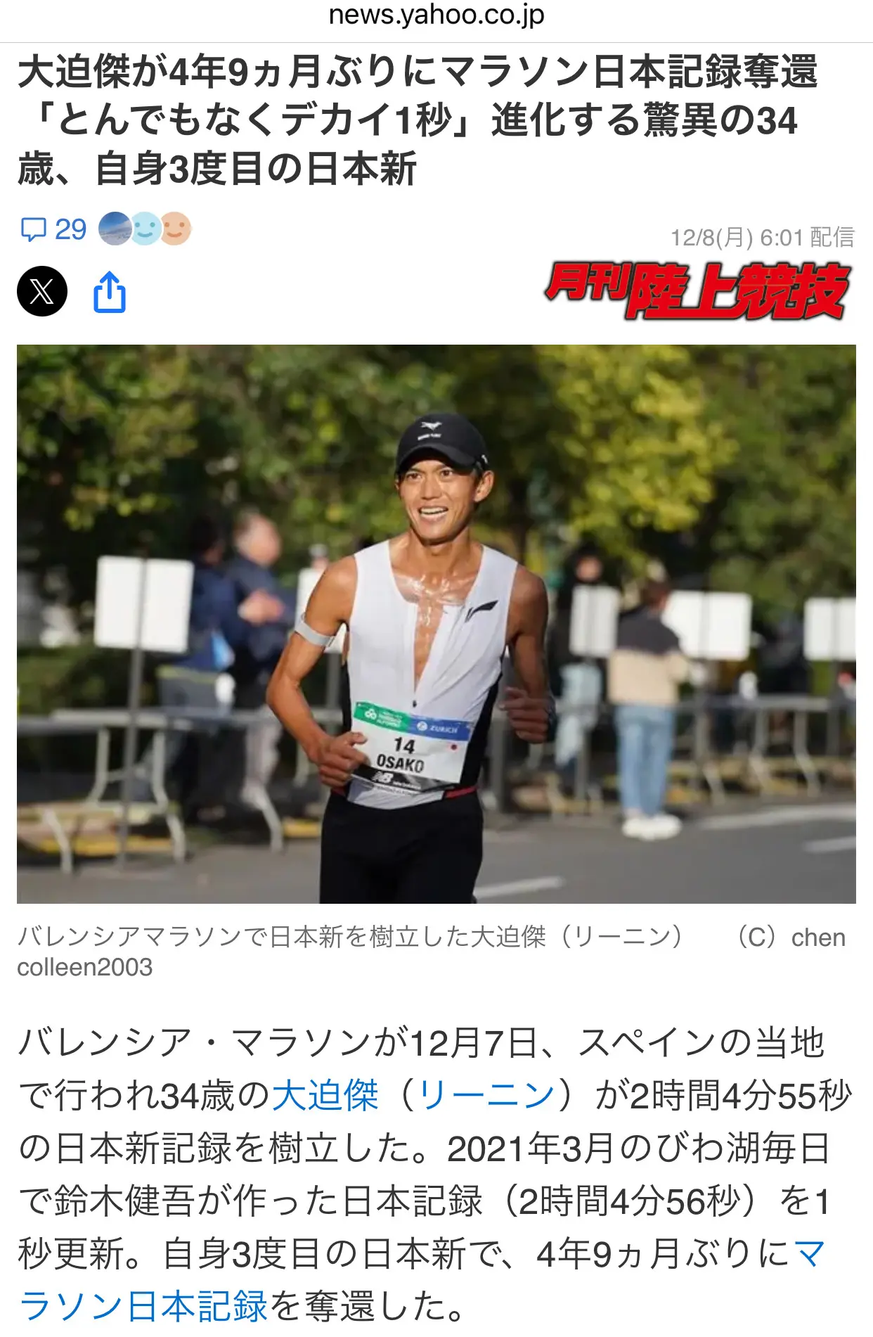 34歳での日本記録更新ということで、肉体的側面はもちろん、個人的には、「シューズ」に着目をしてしまいました。大迫傑選手のランニングフォームとリーニンのシューズの相性が、非常に良かったのだと思います。長距離選手は、「自分のランニングフォームにシューズを合わせるか」「シューズに自分のランニングフォームを合わせるか」の二択なのですが。これがはまると、すごい記録が出るわけです。今回は、大迫傑選手の努力はもちろん、シューズとランニング技術がうまくはまったのも大きかったと思います。