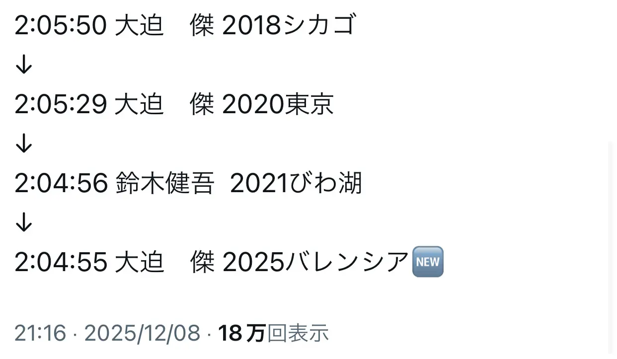 34歳の大迫傑(すぐる)選手が、2時間4分55秒の男子マラソン日本新記録を樹立しました。自身3度目の日本記録更新です。本当に、おめでとうございます(パチパチパチパチ)