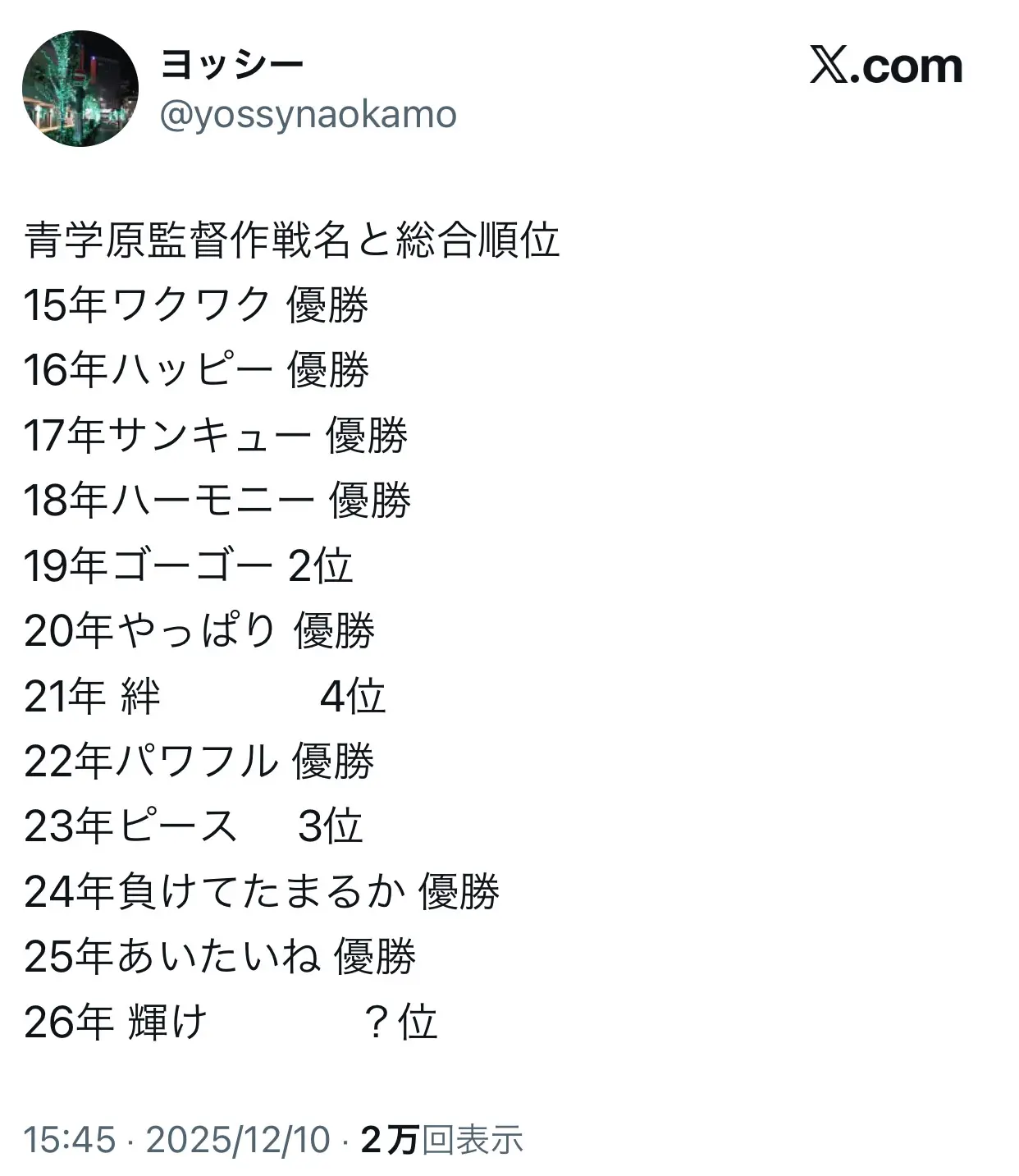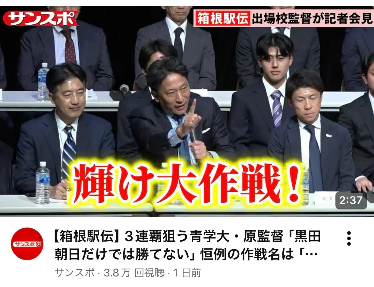 【箱根駅伝】出場校監督による記者会見が行われました。私の優勝予想は、「中央大学」or「駒澤大学」なのですが。ただ、どの大学も戦力が拮抗していますし、当日の選手のコンディションも大きく影響しますので、どこが優勝してもおかしくない状況だと思います。男子選手のみなさんには、体調を整えて、自身の最高の走りを披露してほしいですね。前回、前々回と2連覇をしている注目の青山学院大学からは、恒例の作戦名が発表されまして、今回は、「輝け」大作戦になりました。