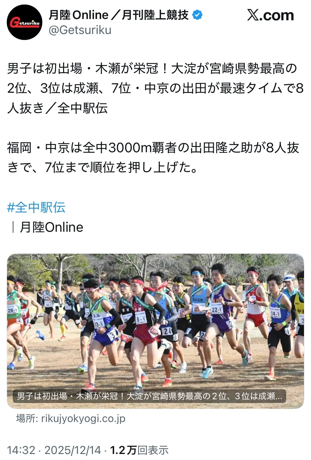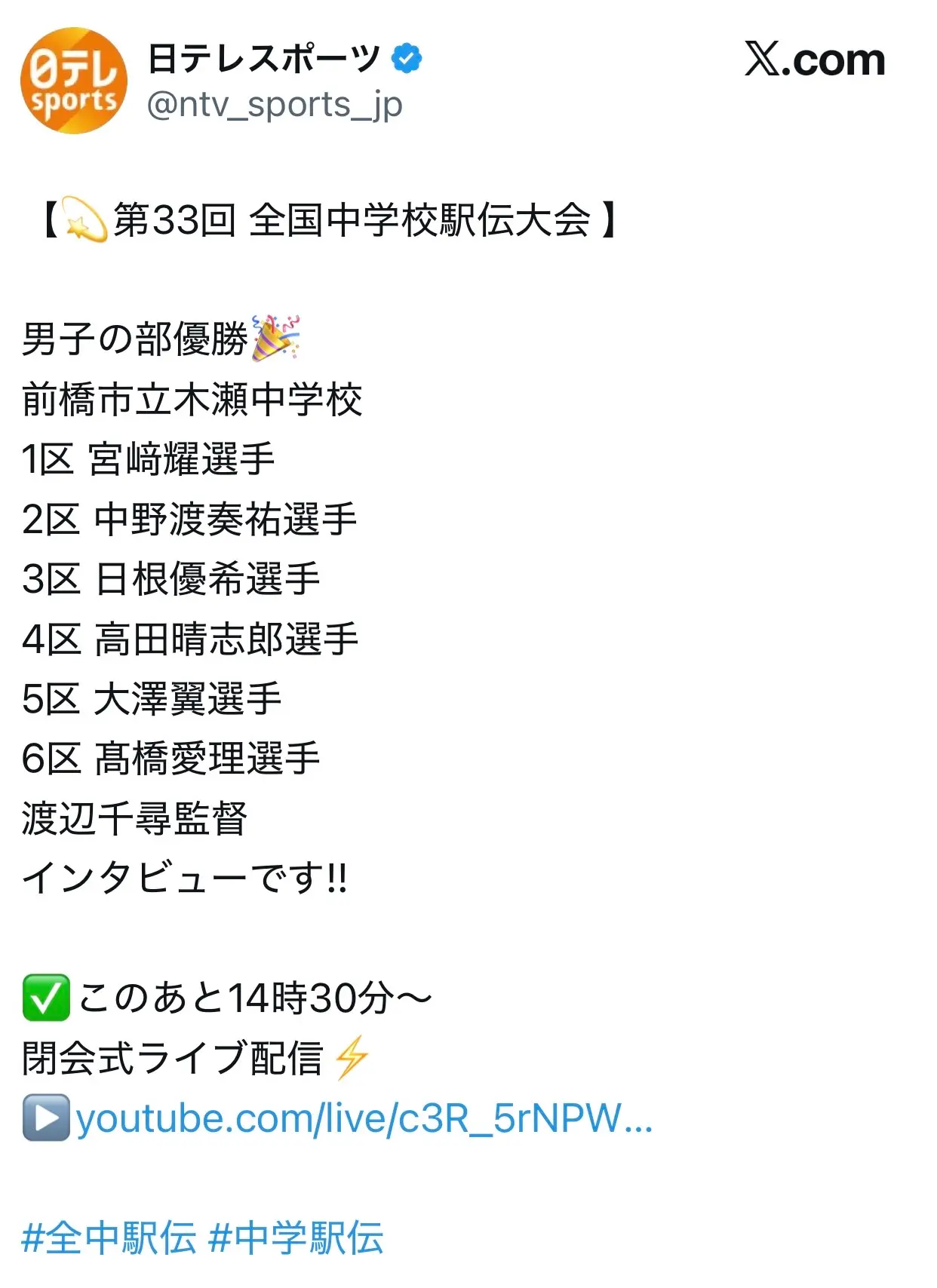 第33回全国中学校駅伝が開催され、前橋市立木瀬中学校が初出場で初優勝を飾りました。本当に、おめでとうございます(パチパチパチパチ)