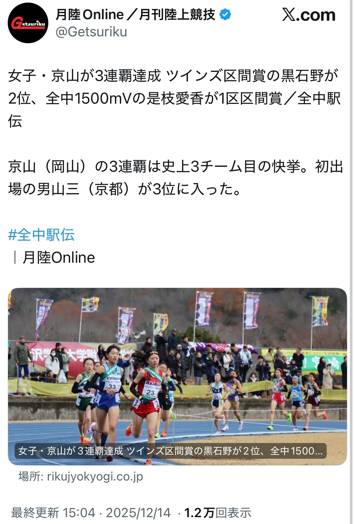 女子は岡山市立京山中学校が3連覇を達成ということで、こちらも素晴らしいですね。思うように走れなかった中学生も、気にすることはありません。中学生は、まだまだ成長途中ですから。高校でがんばれば、中学の時に雲の上の存在だった選手を追い抜くことも可能です。