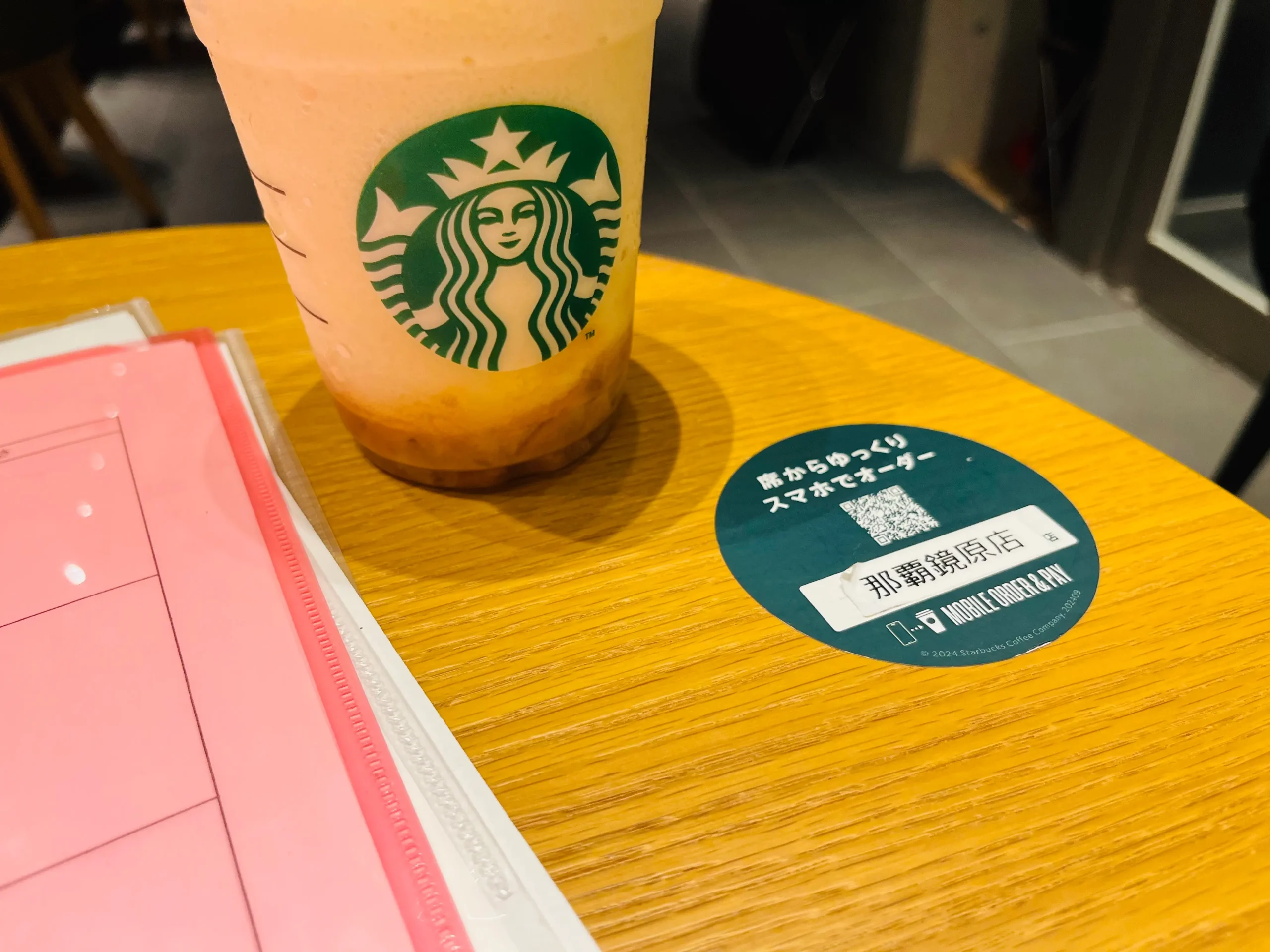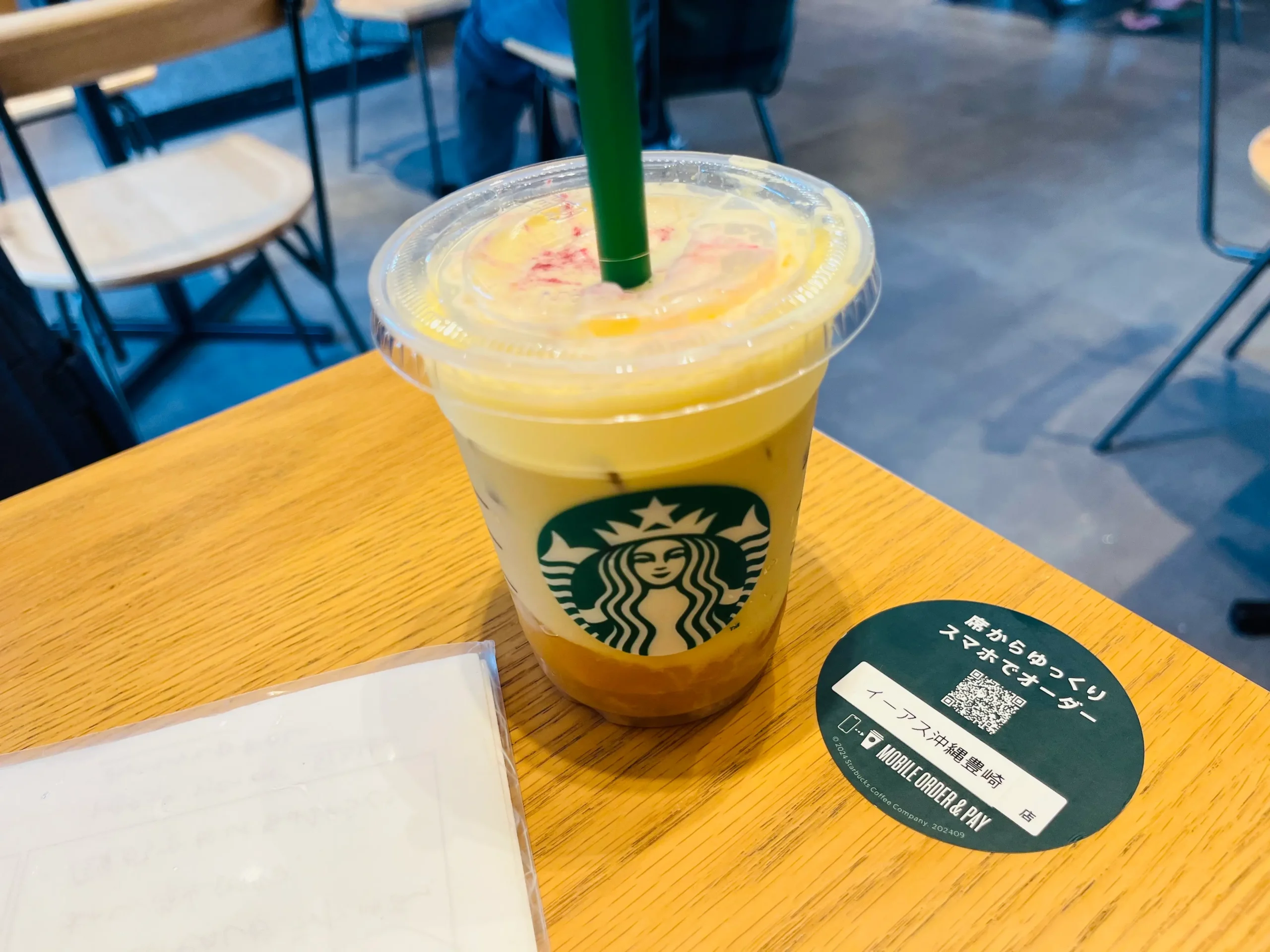 沖縄県のどのスターバックス店舗のモバイルオーダーペイ画面にも、「ほうじ茶香る 焼き芋 ムースティーラテ」が出ていないんですよね。今いる店舗も、売り切れとのこと。やっぱり、店舗によって販売期間が違うのか・・・「ほうじ茶香る 焼き芋 ムースティーラテ」は、写真のとおり、「日本の国旗」をイメージした見た目になっていて。だから、大人気で、在庫切れになっている店舗が多いのでしょう。まぁ、また来年も焼き芋シリーズはくるでしょうから。来年に期待です。