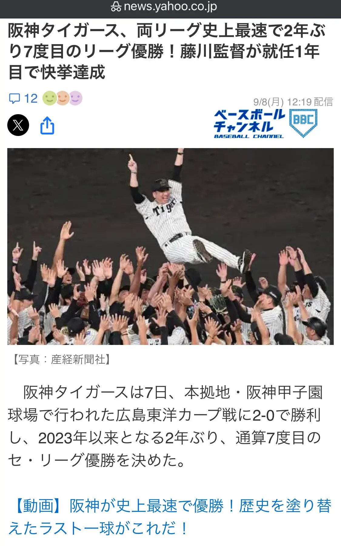 プロ野球で阪神タイガースが、史上最速でのリーグ優勝を成し遂げました。本当に、おめでとうございます。