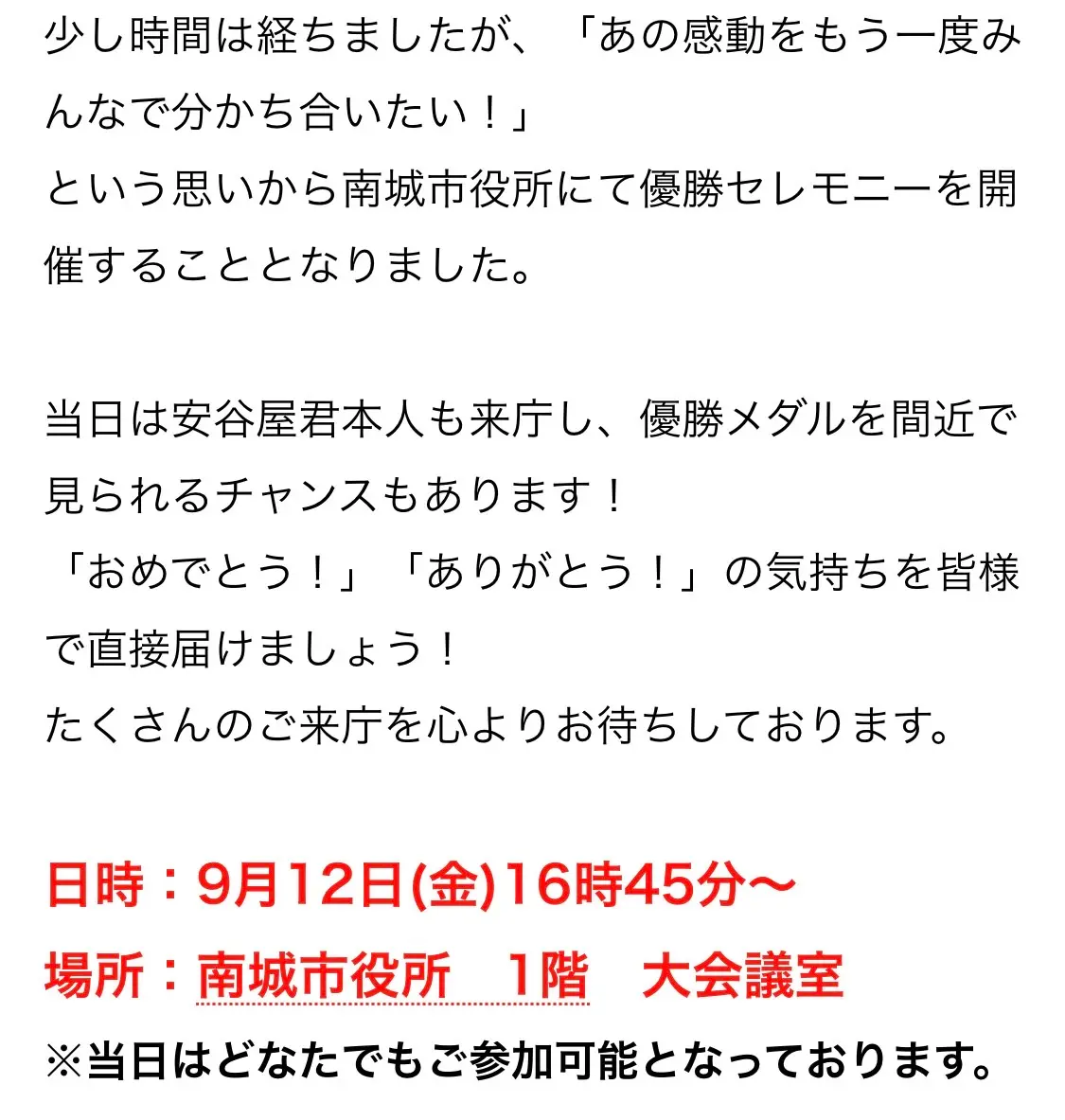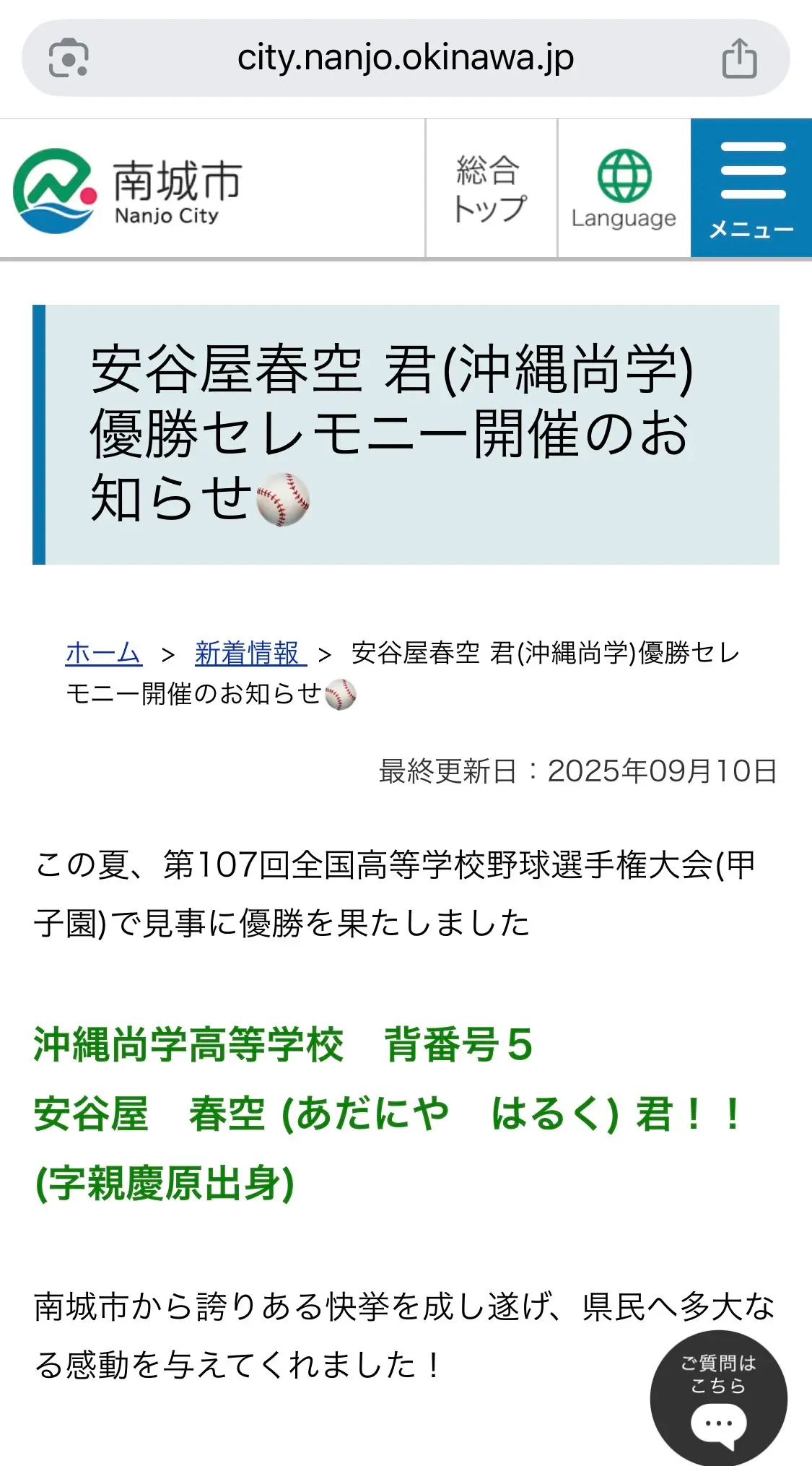 南城市役所で全国甲子園優勝に大きく貢献した沖縄尚学の安谷屋選手の優勝セレモニーが開催されます。南城市出身の安谷屋選手は、沖縄県大会で打率チームダントツNo.1を記録、全国甲子園では、優勝した沖縄尚学の4番を務めるなど、全国優勝に大きく貢献しました。(・・・1人の高校生のために市役所をあげての優勝セレモニーって、沖縄県で南城市だけじゃない?・・・なんで南城市は安谷屋選手をこんなにも盛大にバックアップしているんだ・・・)