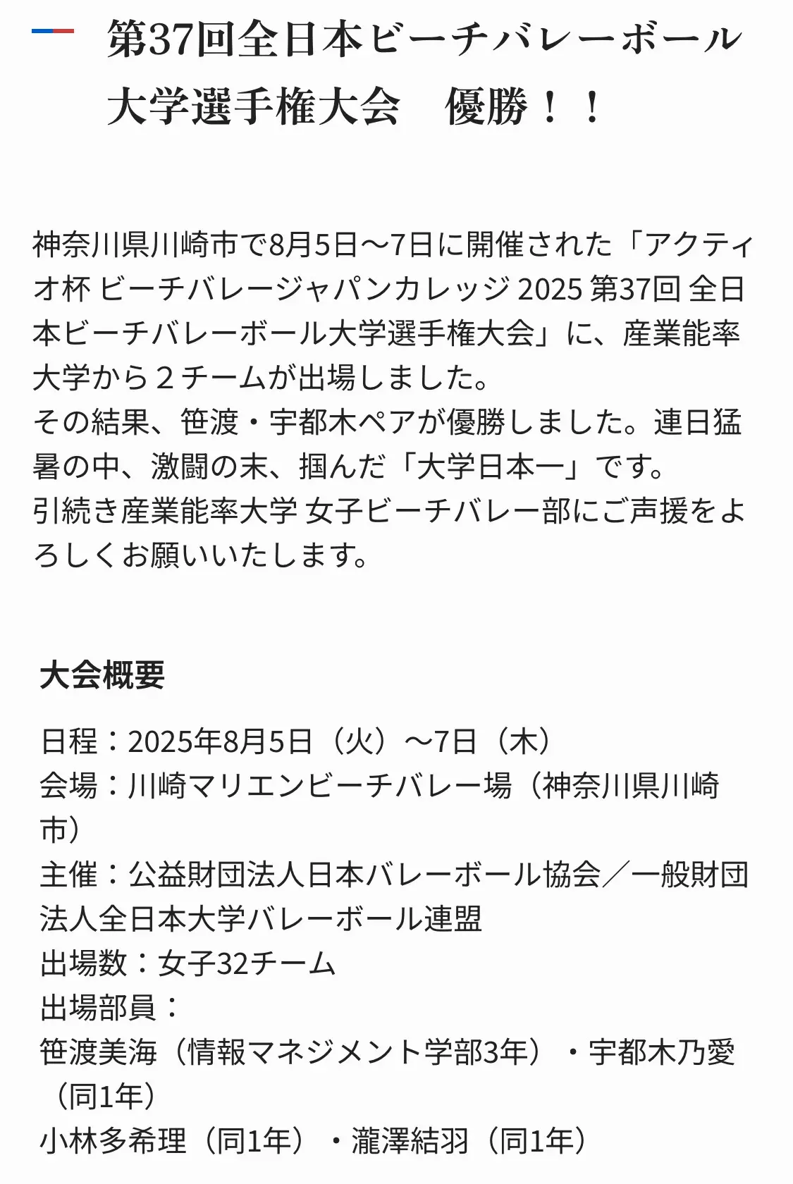 私の母校、産業能率大学のホームページを久しぶりに見たら、ビッグニュースが目に止まりました。全日本ビーチバレーボール大学選手権大会で、優勝したとのことです。女子ビーチバーレーボールの「大学日本一」です。本当に、おめでとうございます。