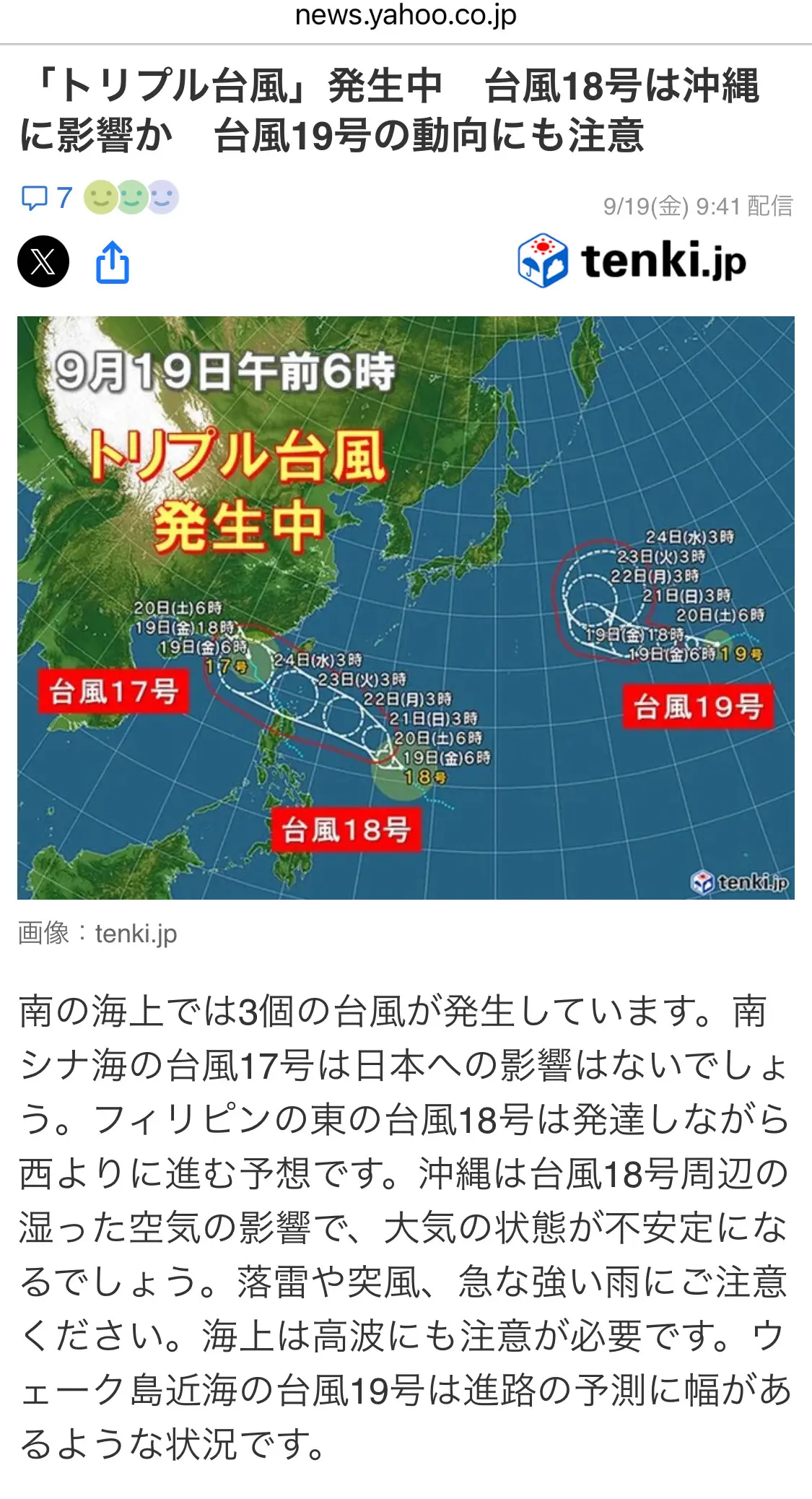 話は変わって、3個の台風が同時に発生するという、珍しい現象が起きています。要注意ですね。