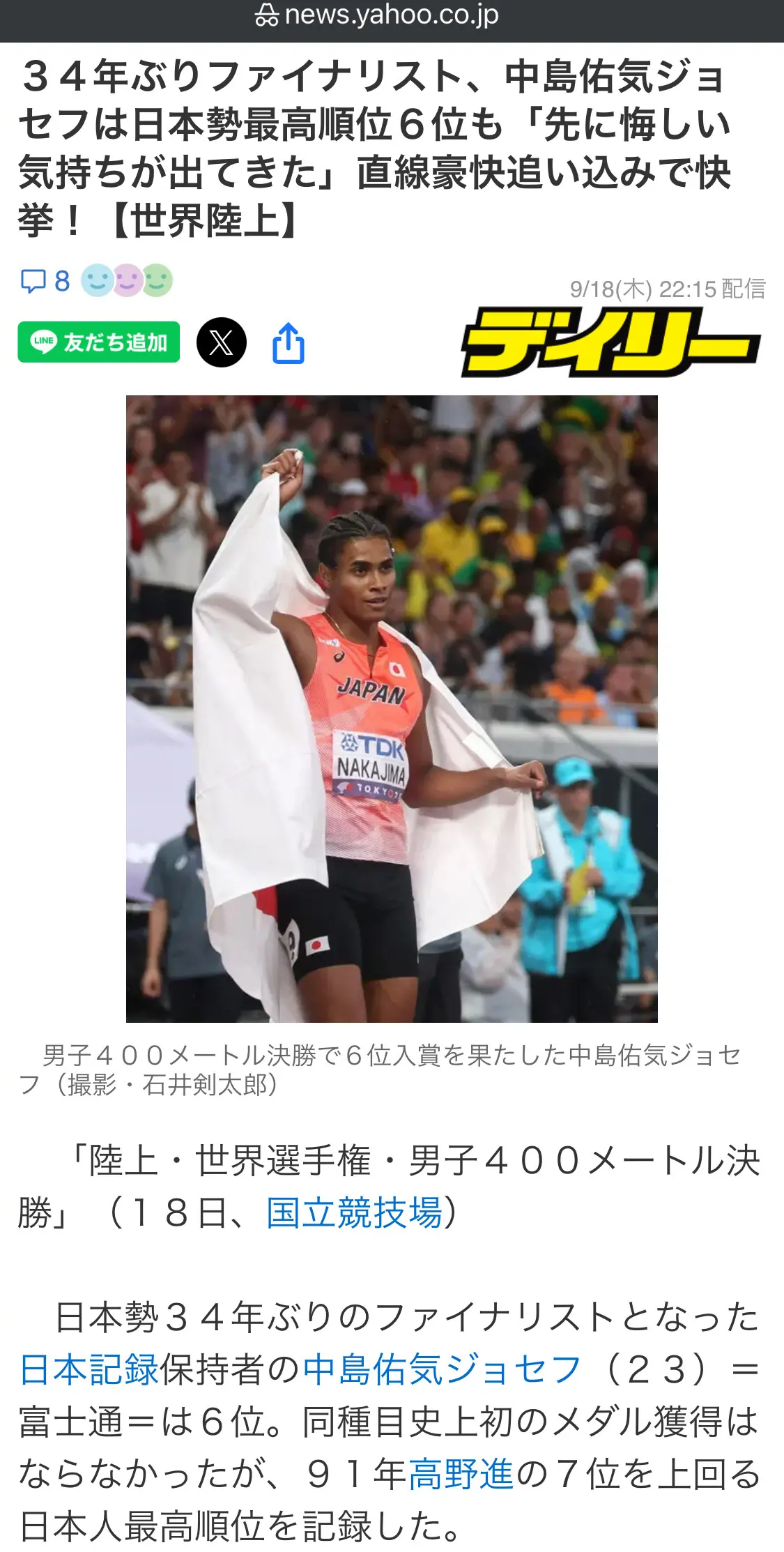 昨晩は、中島佑気ジョセフ選手(富士通)も、男子400mで日本記録を更新しました。これも、本当にすごかったです。