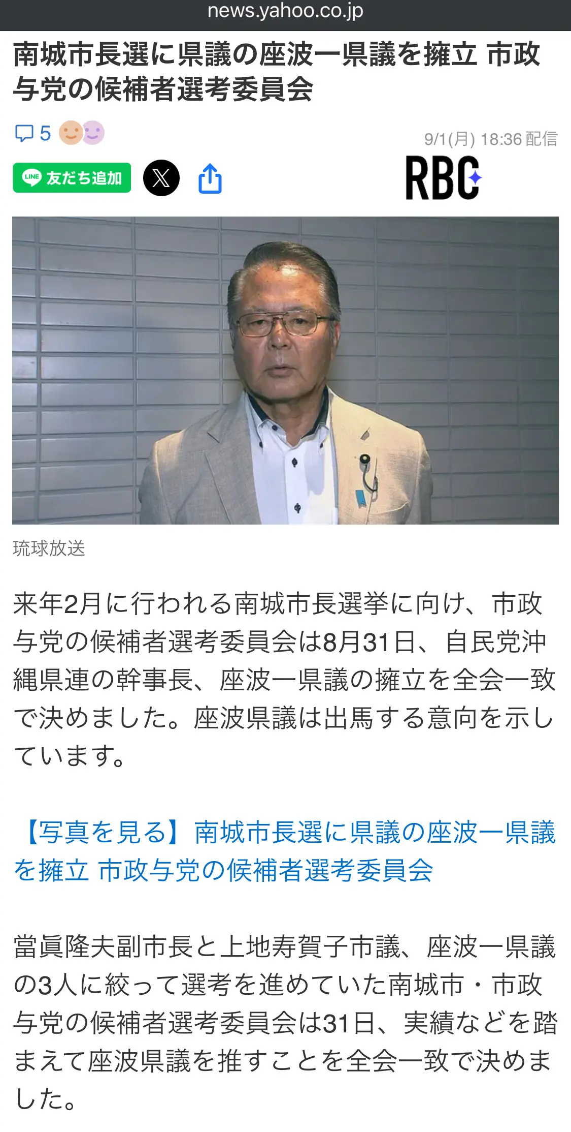 今週金曜日の議会で不信任決議案が可決されれば、伊東市の田久保市長と同じ状況になるわけで。市長をやめるか、議会を解散するかを選ぶことになるわけです。田久保市長は、議会を解散することを選びましたが。南城市長は果たして・・・私個人的には、潔く辞めて、座波一さんに南城市長を任せたほうがよいと思っています。南城市の市政与党の候補者選考委員会も、次の南城市長に座波一さんを推すことを全会一致で決定していますし。
