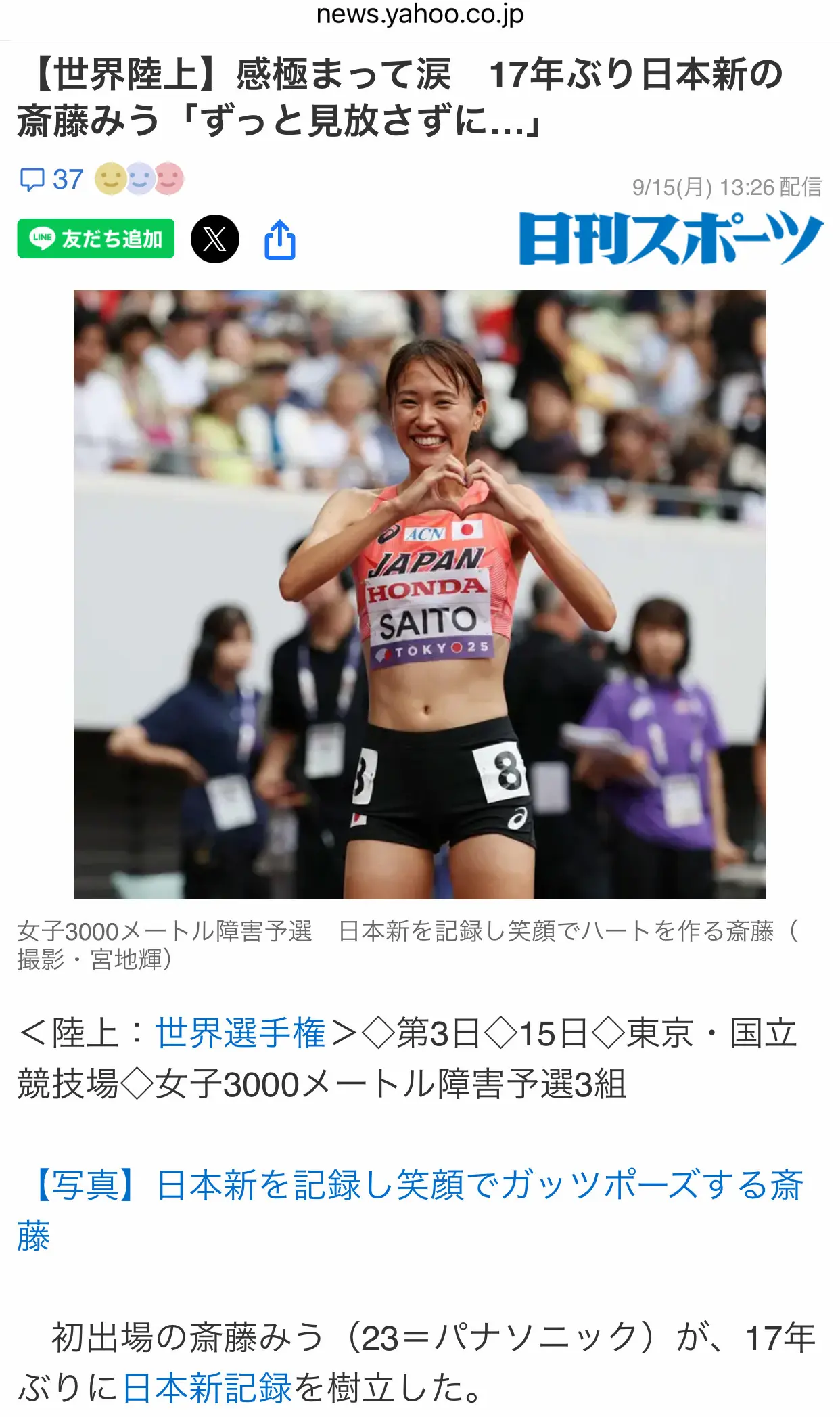 世界陸上の女子3000m障害予選で、齋藤みう選手(日本体育大学~パナソニック)が、日本新記録を樹立しました!本当に、おめでとうございます(パチパチパチパチ)齋藤みう選手は、日本体育大学時代から毎回のレースで全力を出し切っているイメージがあり。日々、限界値を超えて成長しよう成長しようという意欲がみえる選手でした。長年のそういった意識、努力が形になった成果だと思います。更なる記録更新を期待です。