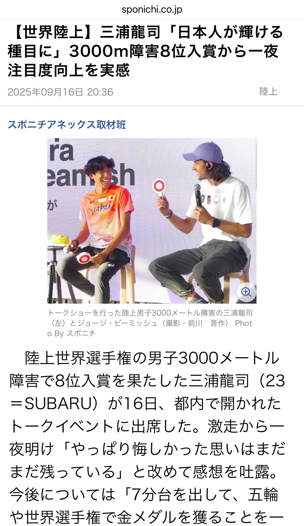 世界陸上の男子3000m障害で、国民からメダル獲得へ大きな期待がかかっていた三浦龍司選手(スバル)。メダル獲得とならず、落ち込んでいるかなと思っていたのですが。今大会の男子3000m障害で金メダルに輝いたジョージ選手とのトークショーでは、満面の笑顔がみれた模様です。よかったよかった。7分台で走れる走力をつけて、ぜひ、次はメダルを獲得してほしいですね。