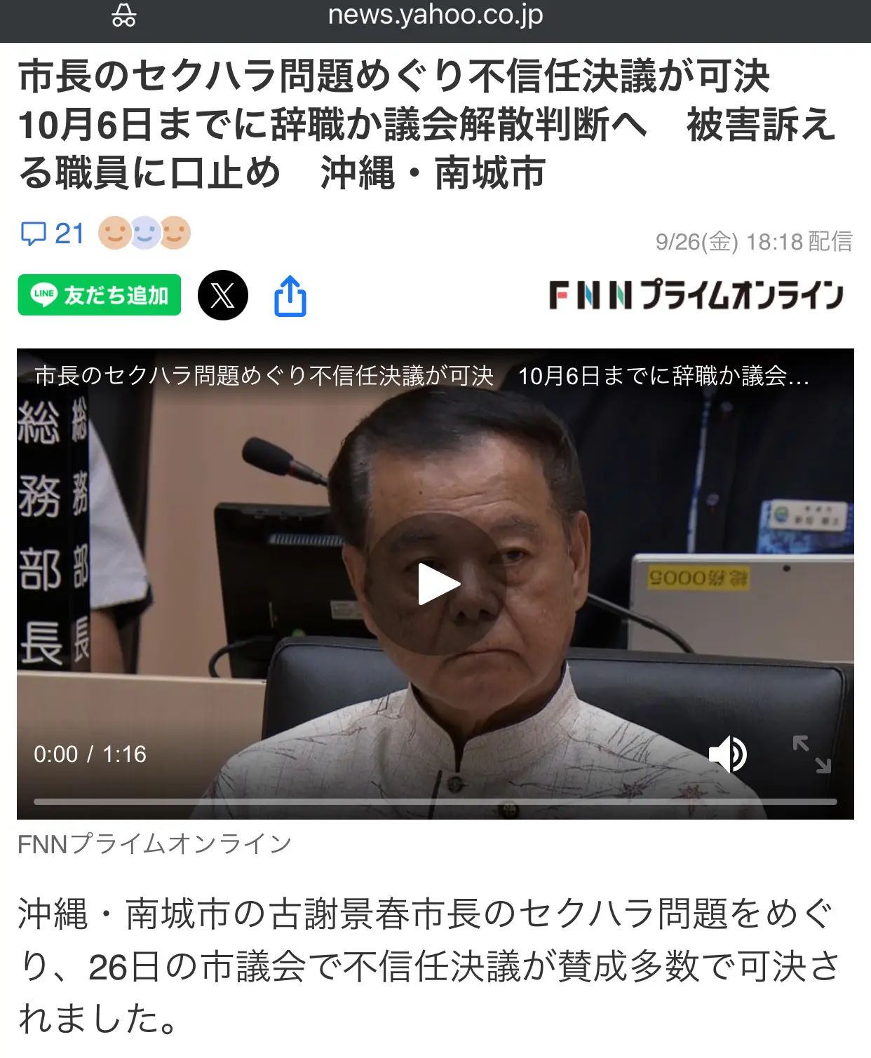 話は変わって、今、南城市長が大変なことになっています。市長室でセクハラをしたという音声データが公開されたのです。SNSやニュースで拡散され、南城市が大問題になっています。
