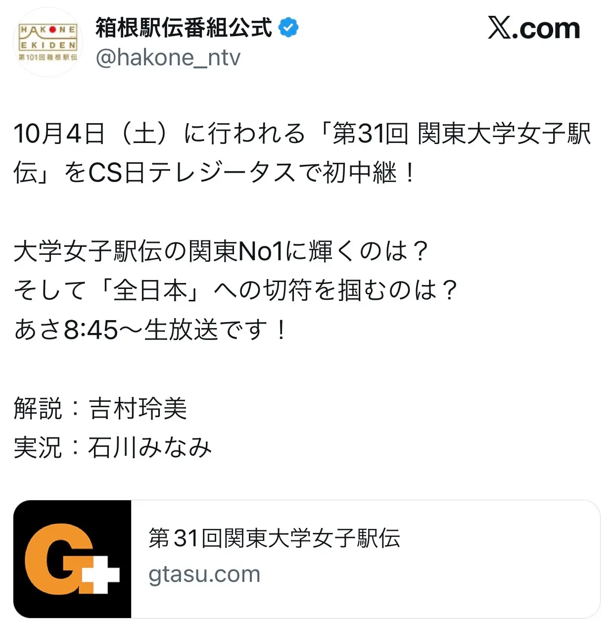 来週は、関東大学女子駅伝も開催されます。なんと今年は、CS日テレジータスで初中継です。目を引いたのが、解説に、「吉村玲美」選手の名前が・・・どんな解説をするか気になる。むしろ、「吉村玲美」選手の解説を聞きたいがために関東大学女子駅伝を観たい。