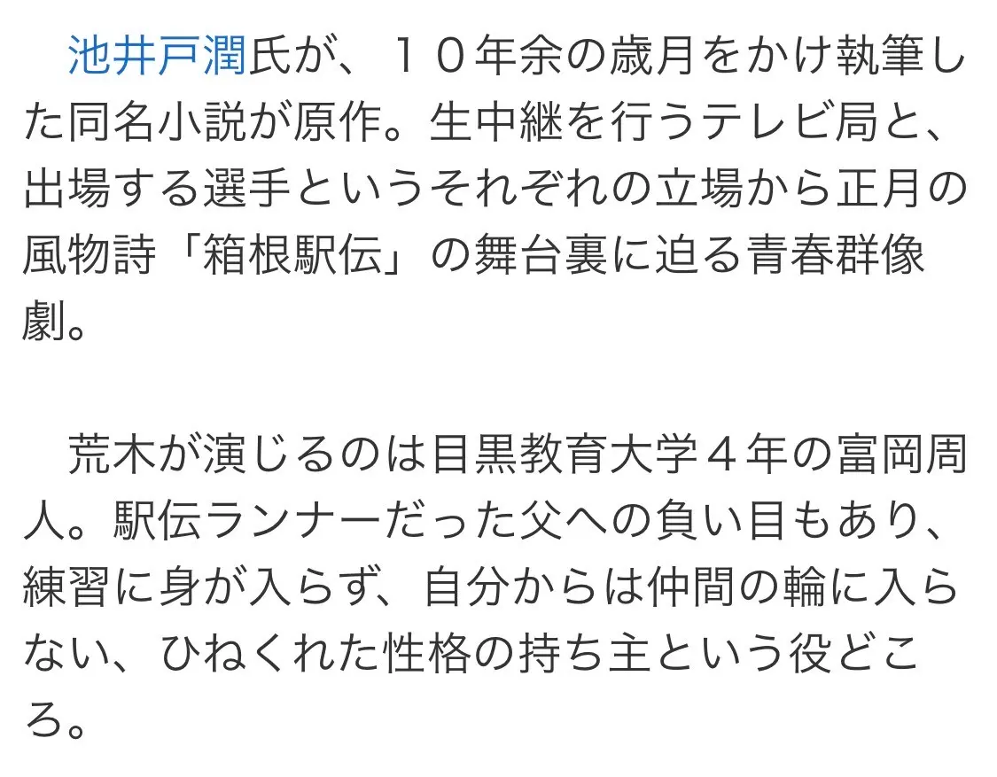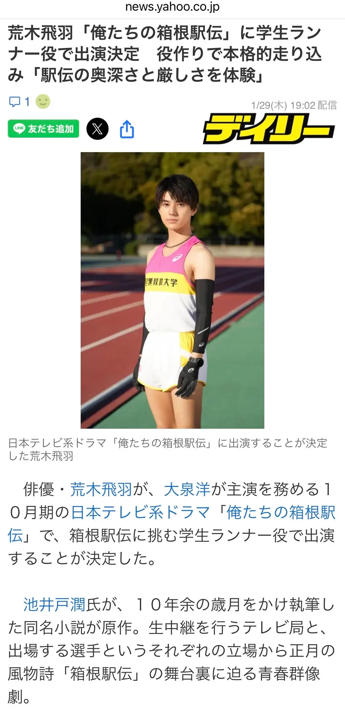 俳優の荒木飛羽さんが、日本テレビ系ドラマ「俺たちの箱根駅伝」で、目黒教育大学4年の富岡周人役で出演することが決定しました。放送は今年10月からですが、今からたのしみです。箱根駅伝がドラマ化されることで、陸上人気が高まりそう。