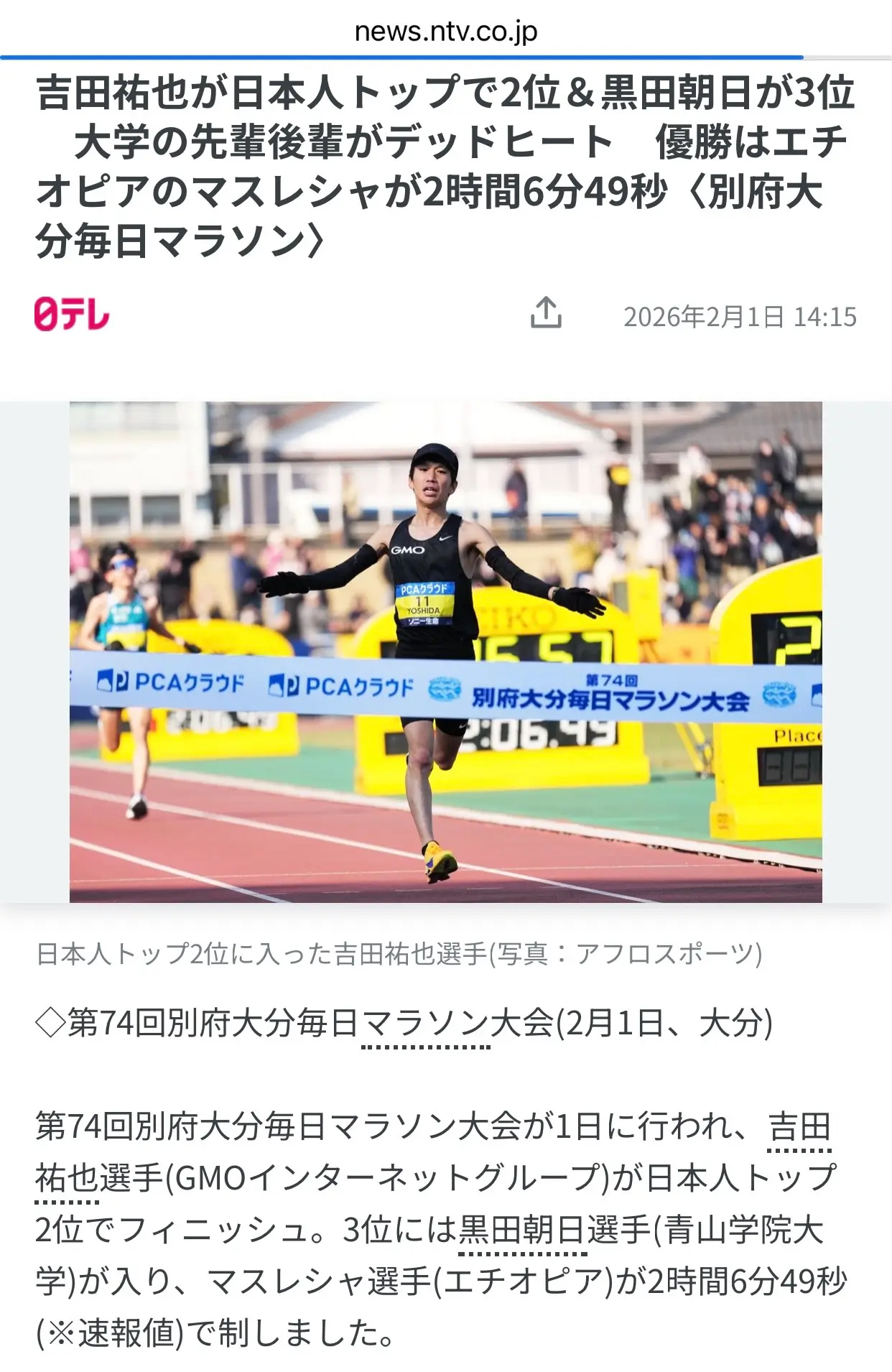 別府大分毎日マラソンが昨日開催され、吉田祐也選手(GMOインターネットグループ)が日本人トップの全体2位でフィニッシュしました。東京世界陸上・マラソン男子日本代表の貫禄を示しました。