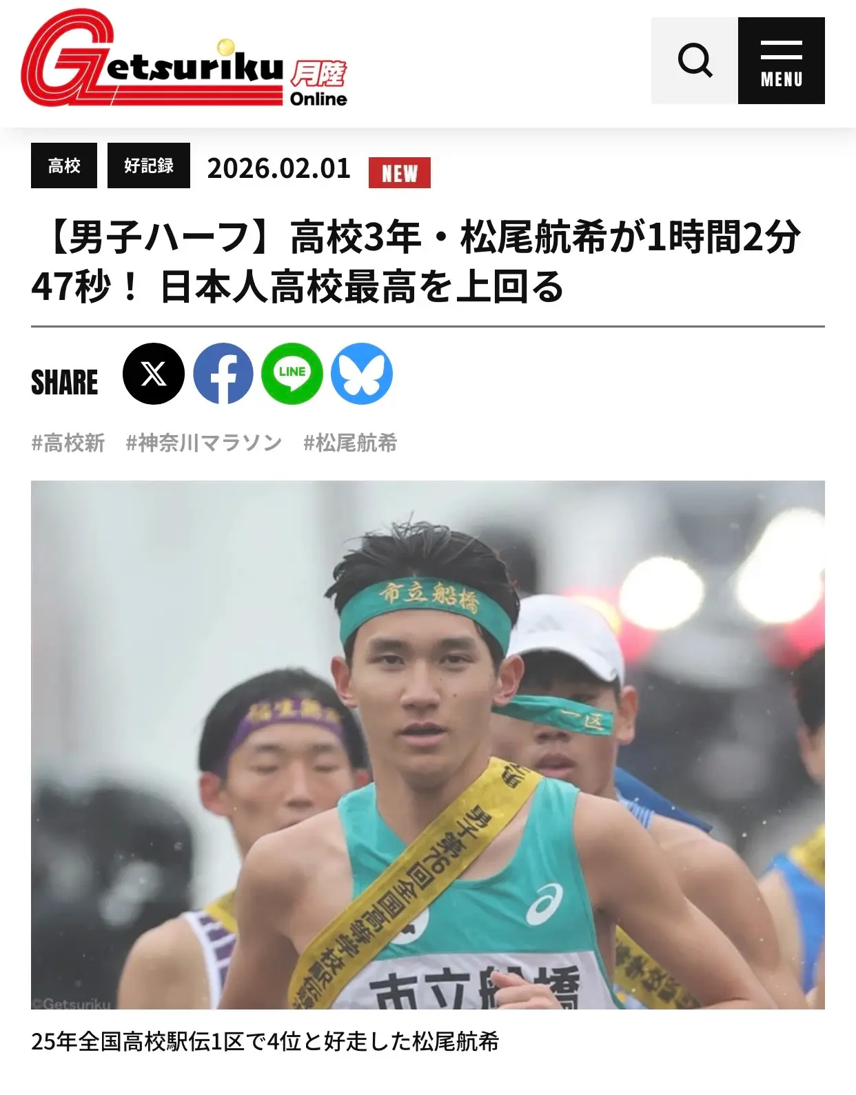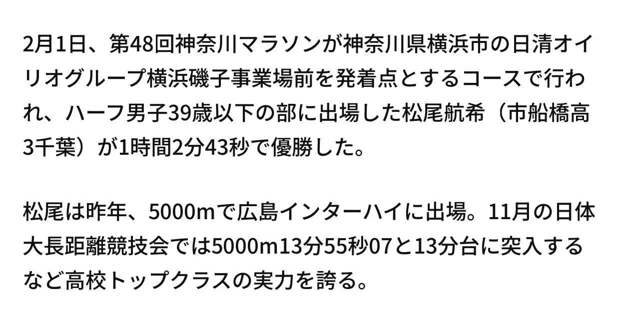 昨日は、すばらしい記録も誕生しました。松尾航希選手(市立船橋高)がハーフマラソンで1時間2分47秒の日本人高校最高記録を樹立したのです。日本人の高校生ではじめて、1時間2分台突入です。おめでとうございます(パチパチパチパチ)大学での活躍にも、目が離せません。