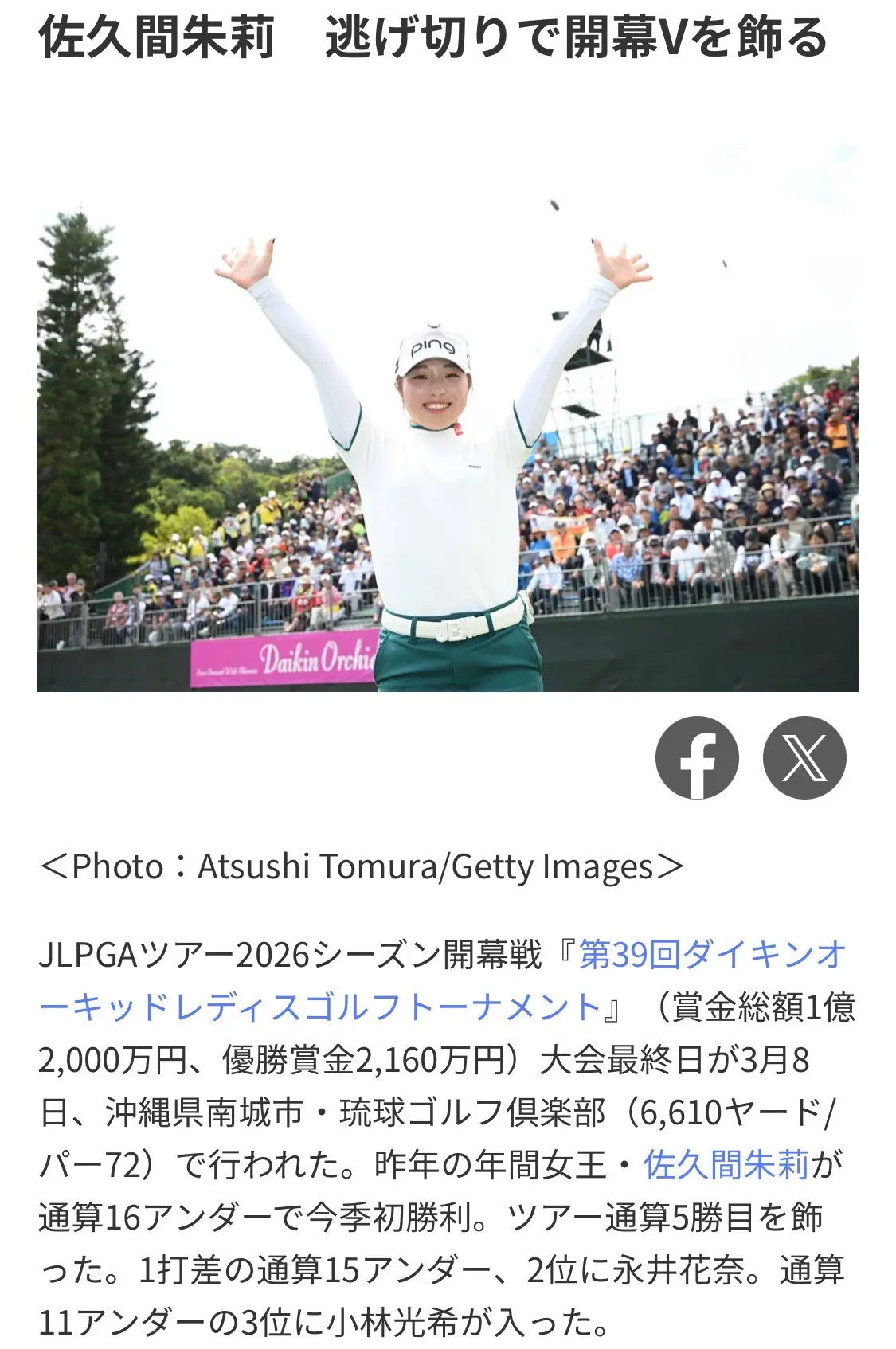 日本女子プロゴルフの開幕戦「ダイキンオーキッドレディスゴルフトーナメント」が開催され、佐久間朱莉選手が優勝を飾りました。おめでとうございます(パチパチパチパチ)