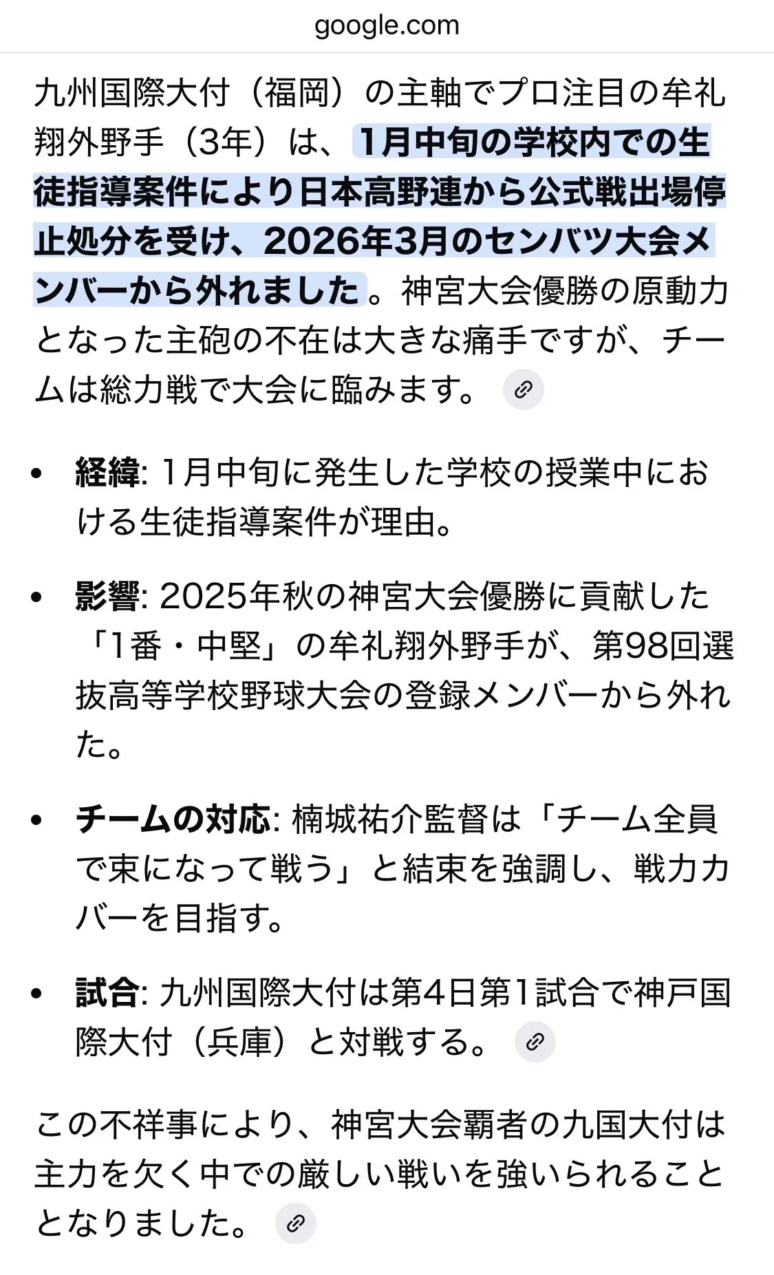 春のセンバツ甲子園の優勝候補、昨年秋の明治神宮野球大会で優勝し日本一になった九州国際大付属高校に、激震が走っています。イチロー選手から絶賛され、世代No.1の呼び声も高く、ドラフト1位指名確実といわれている「むれ翔」選手が、センバツ甲子園のメンバーから外れているのです。理由は、授業中に発生した生徒指導案件とのことですが。事実かどうかは不明です。