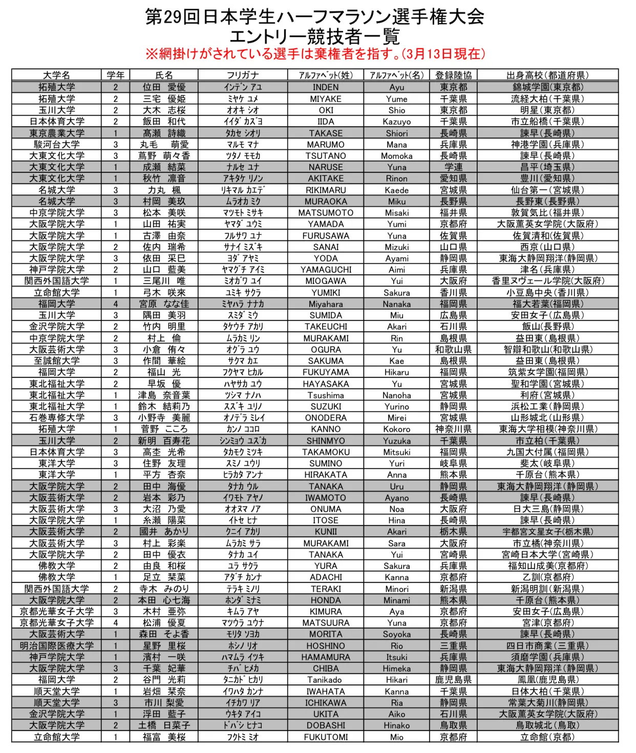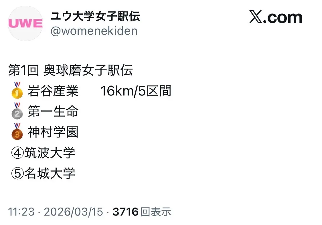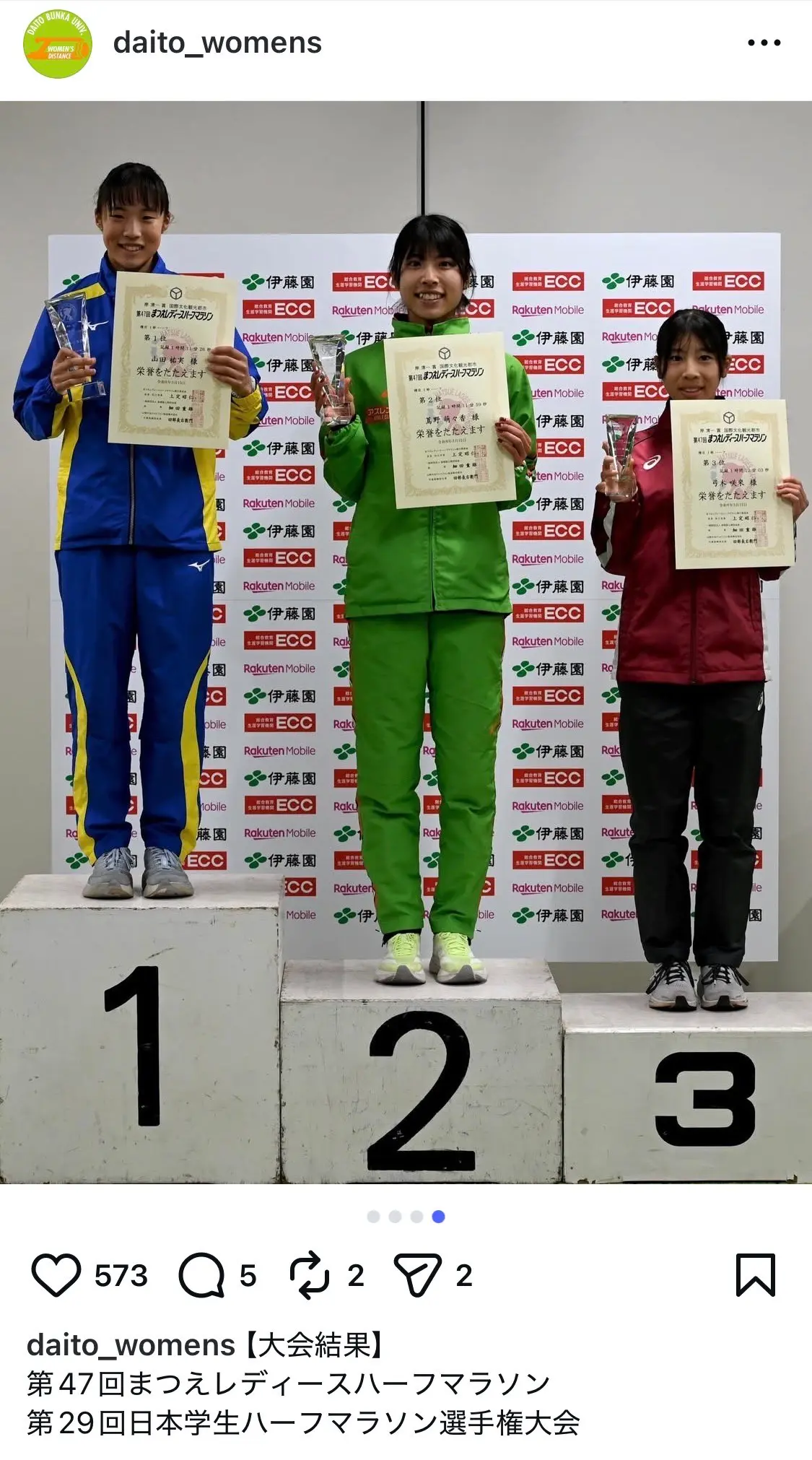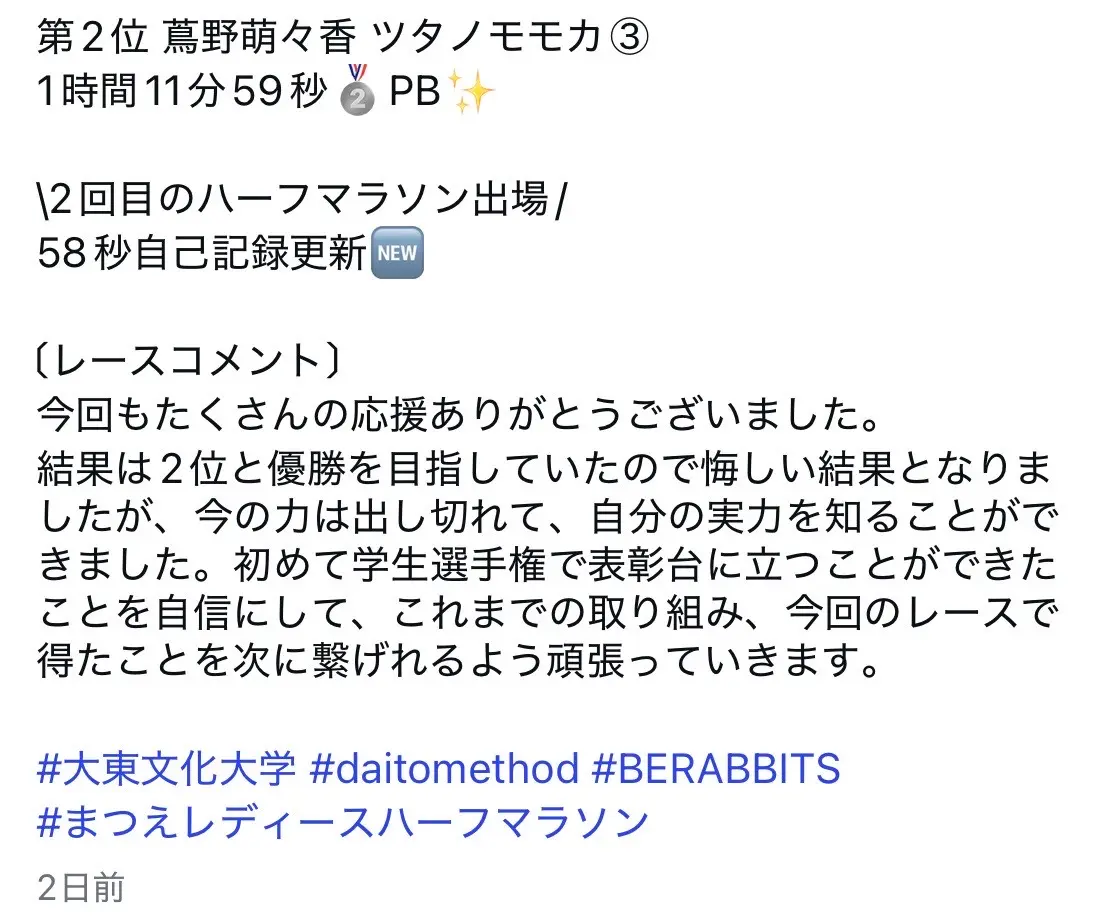 そして先日日曜日には、日本学生女子ハーフマラソン選手権大会も開催されまして、蔦野ももか選手(大東文化大学)が2位に入る快挙を達成しました。本当に、おめでとうございます(パチパチパチパチ)