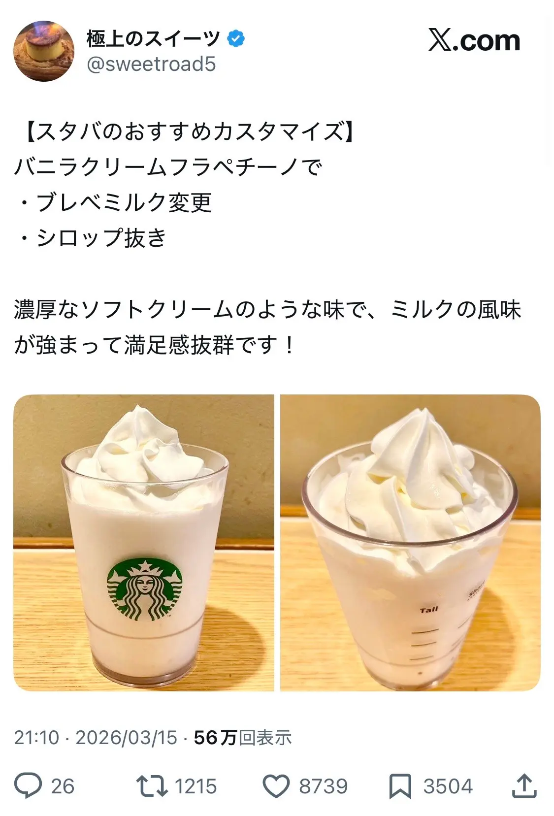 出張パーソナルトレーニングの合間にスターバックスに寄り、極上のスイーツで紹介されていたカスタマイズをやってみました。本当に、濃厚なソフトクリームという感じです。