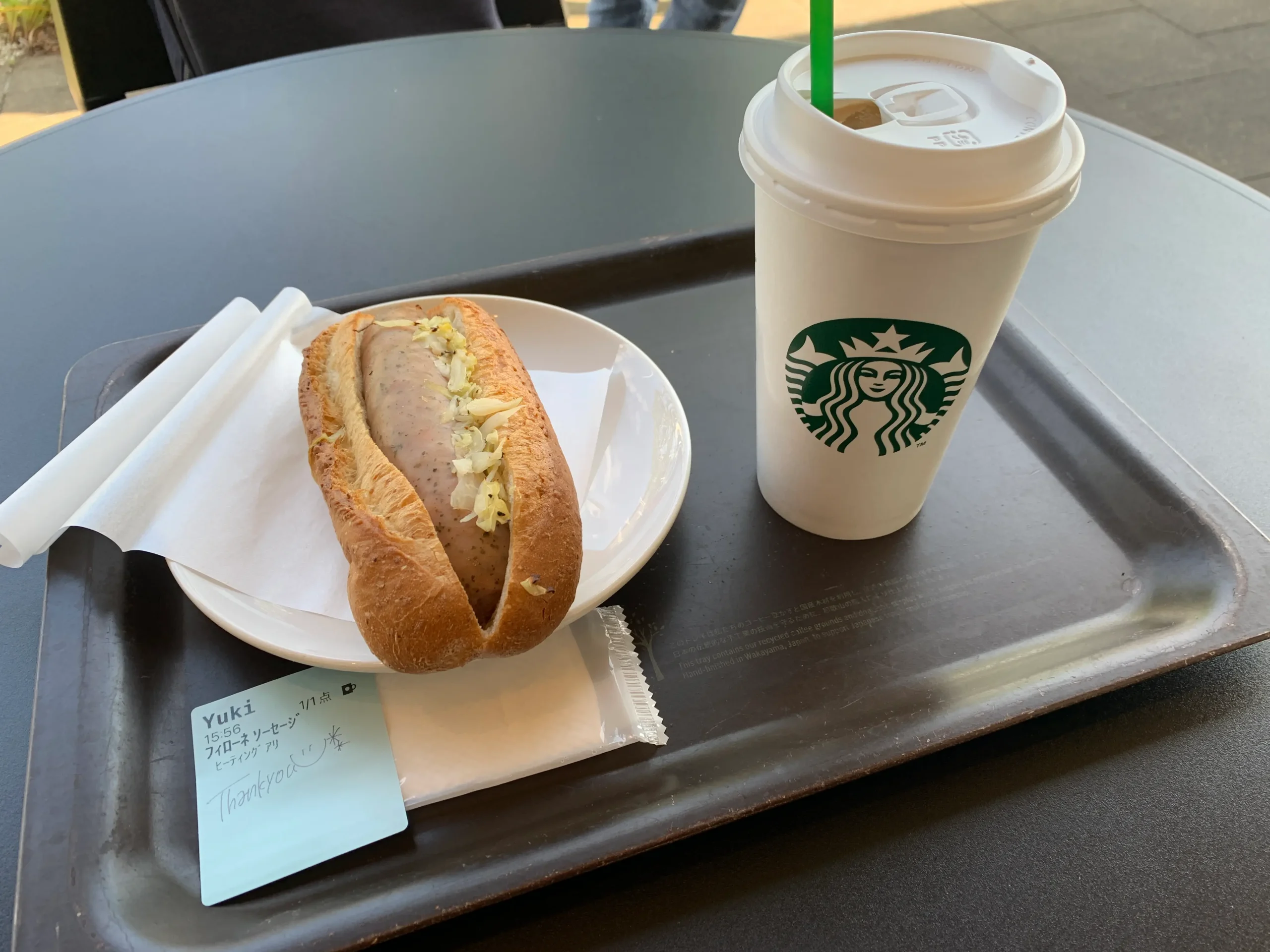 出張パーソナルトレーニングの前に、スターバックス読谷店に寄ったのですが。持ち帰りで注文したアメリカンワッフルを店内に忘れてしまいました、、、破棄されてるかもなと思って、出張パーソナルトレーニングを終えて戻ってみたのですが、なんと、テーブルの上に置かれたままでした。