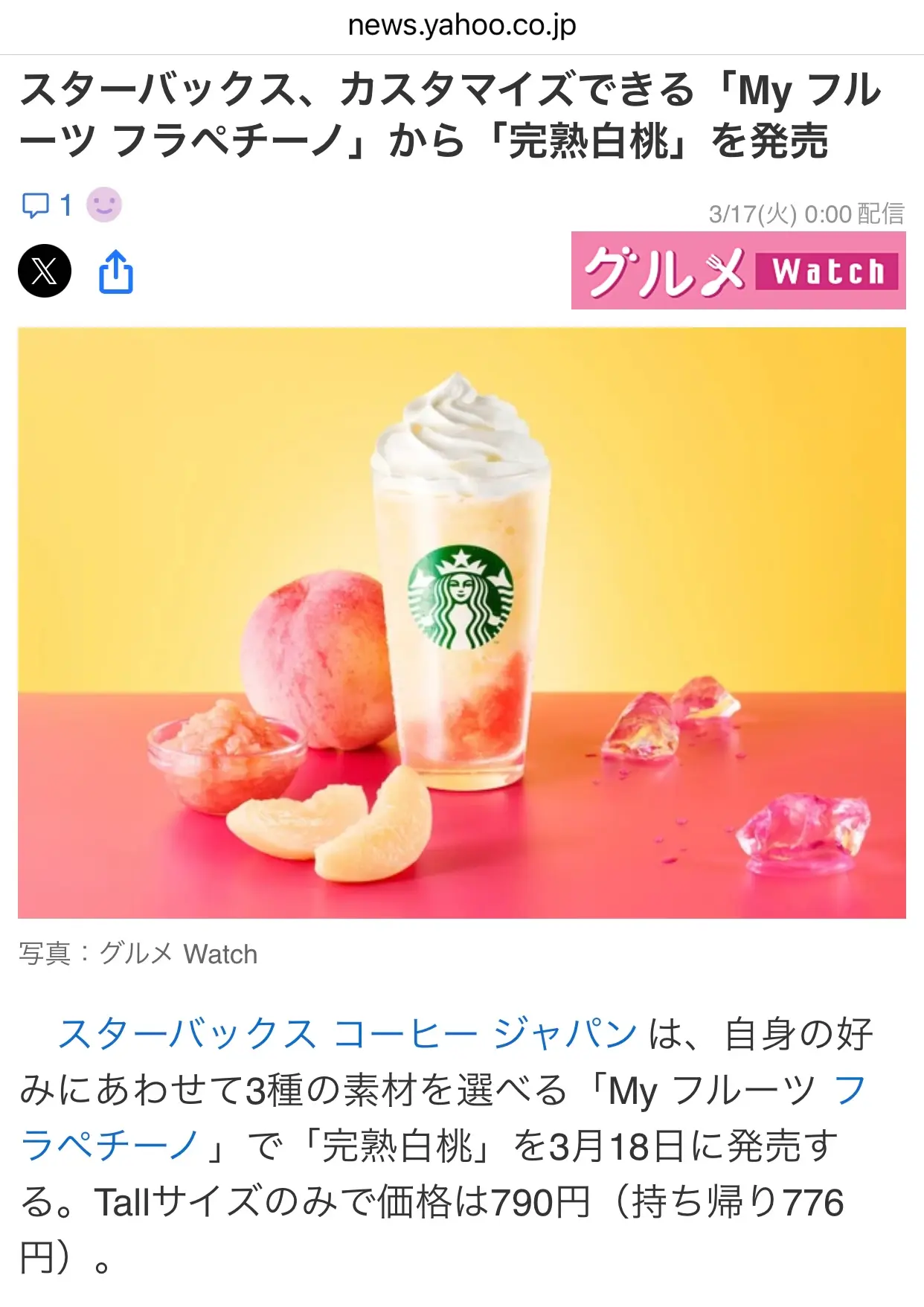 スタバといえば、今日から、自分好みのフラペチーノを作れる「My フルーツ³ フラペチーノ®」の「完熟白桃」が発売されています。