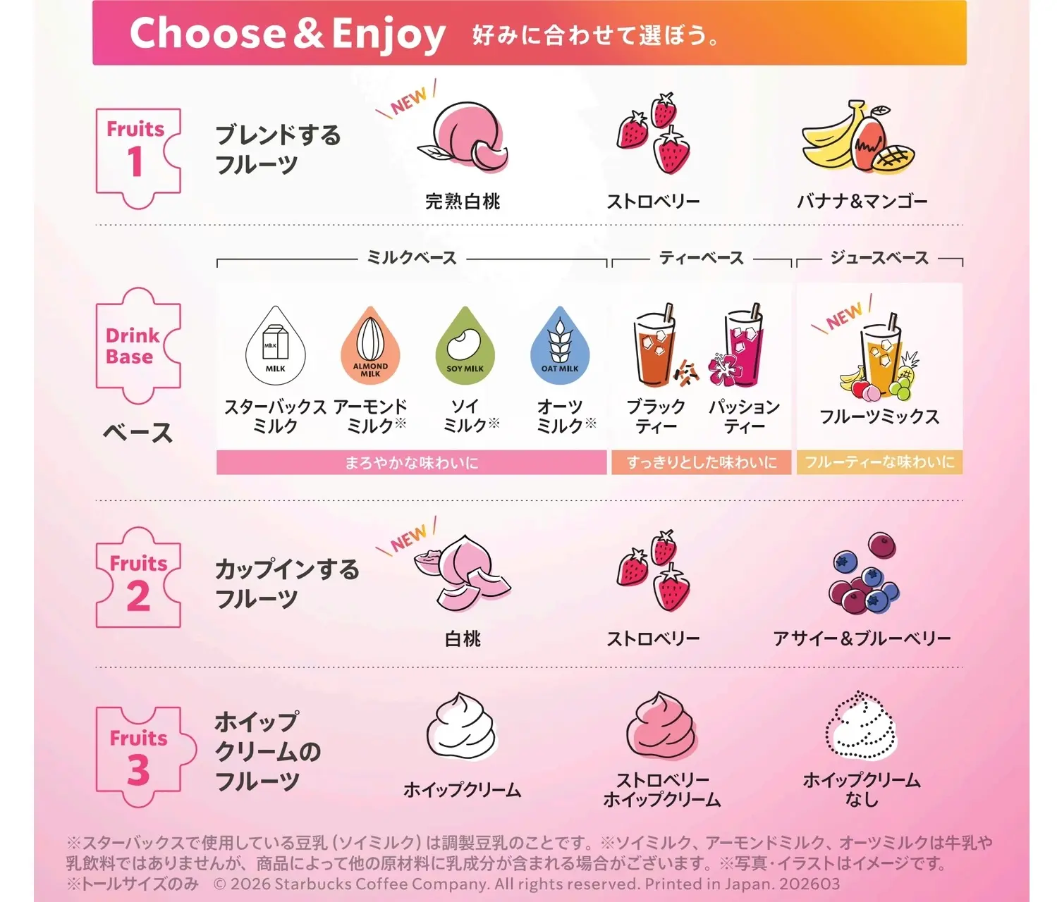 「My フルーツ³ フラペチーノ®」は、ブレンドするフルーツ、カップインするフルーツ、ホイップクリームのフルーツの3つを組み合わせて、自分好みのフラペチーノを作れるサービスです。