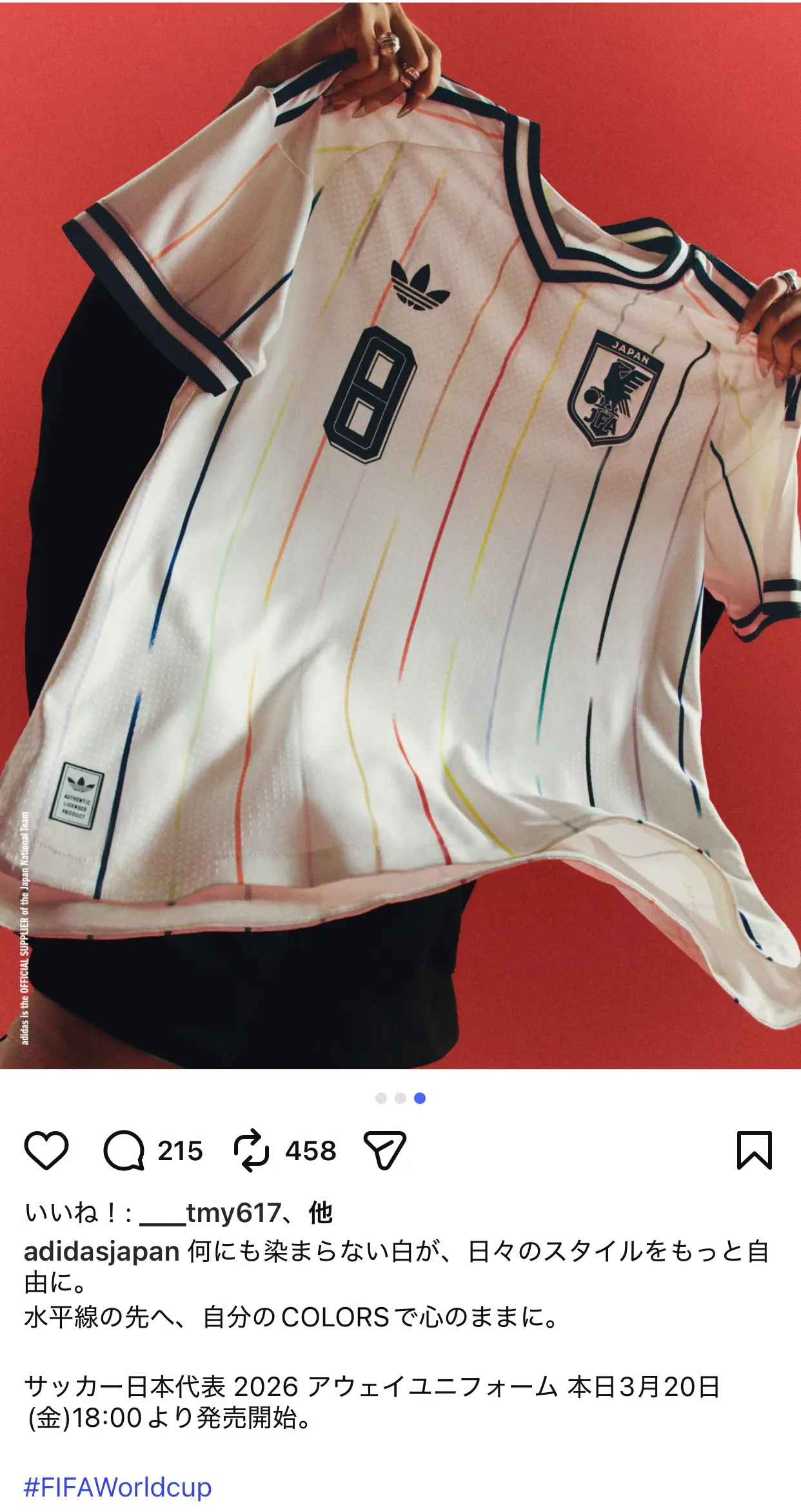 アディダスジャパンと日本サッカー協会から、日本代表が着用するアウェー用の新ユニフォームが発表されました。カッコいい。サッカー観戦時はもちろん、普段着としてもいけそうな感じです。