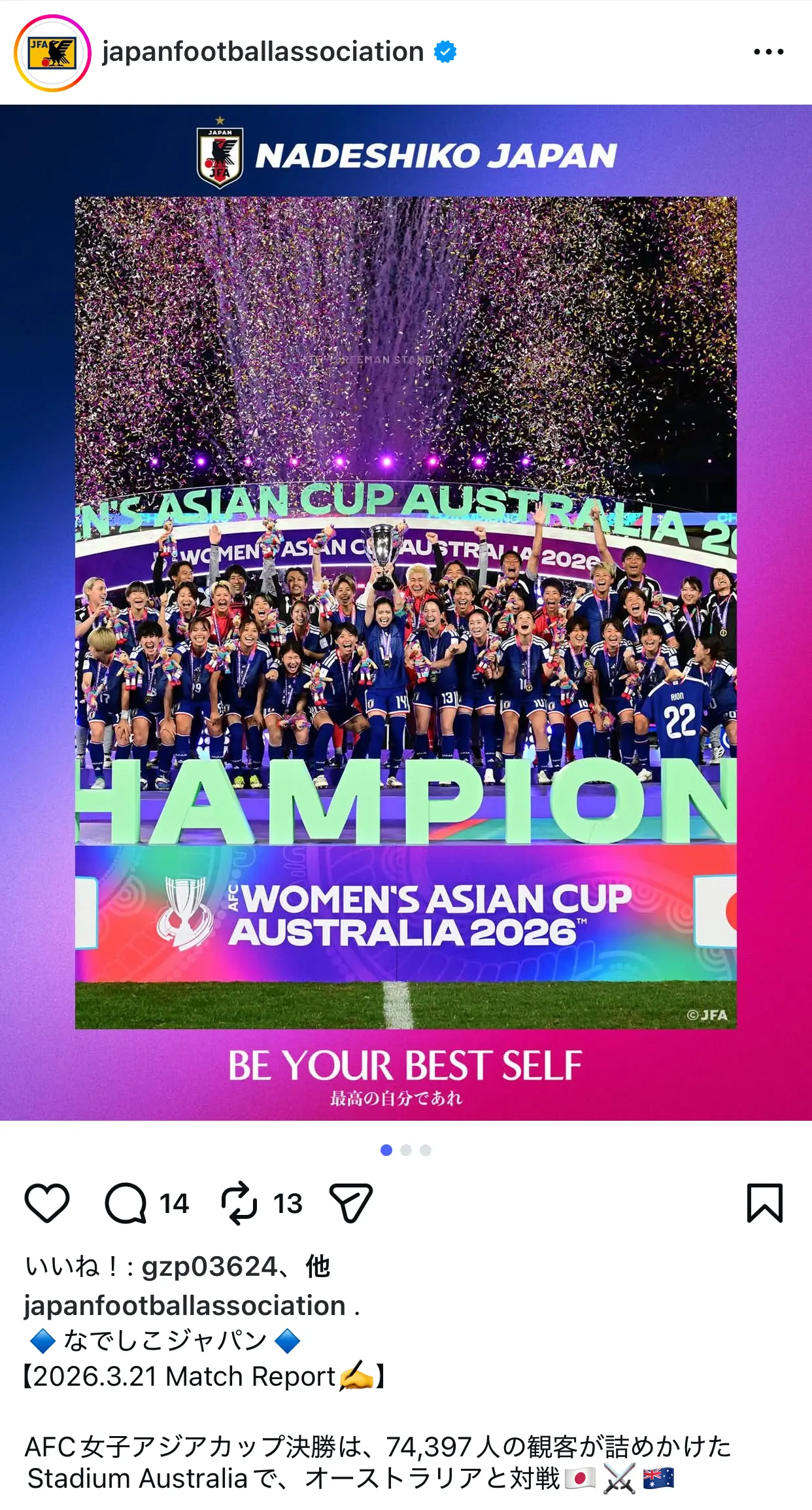 なでしこジャパン、強し。AFC女子アジアカップオーストラリア2026、優勝おめでとうございます(パチパチパチパチ)
