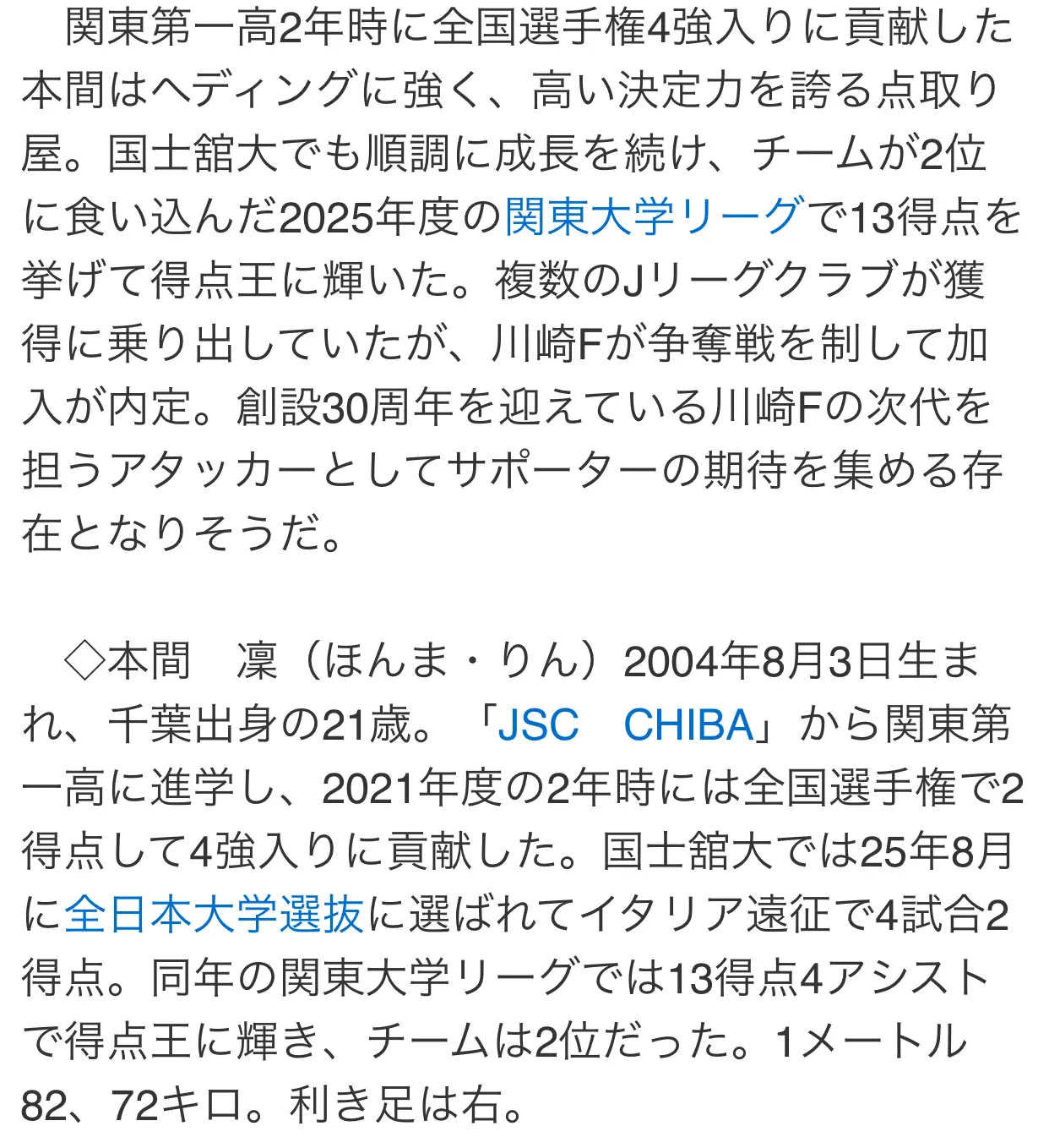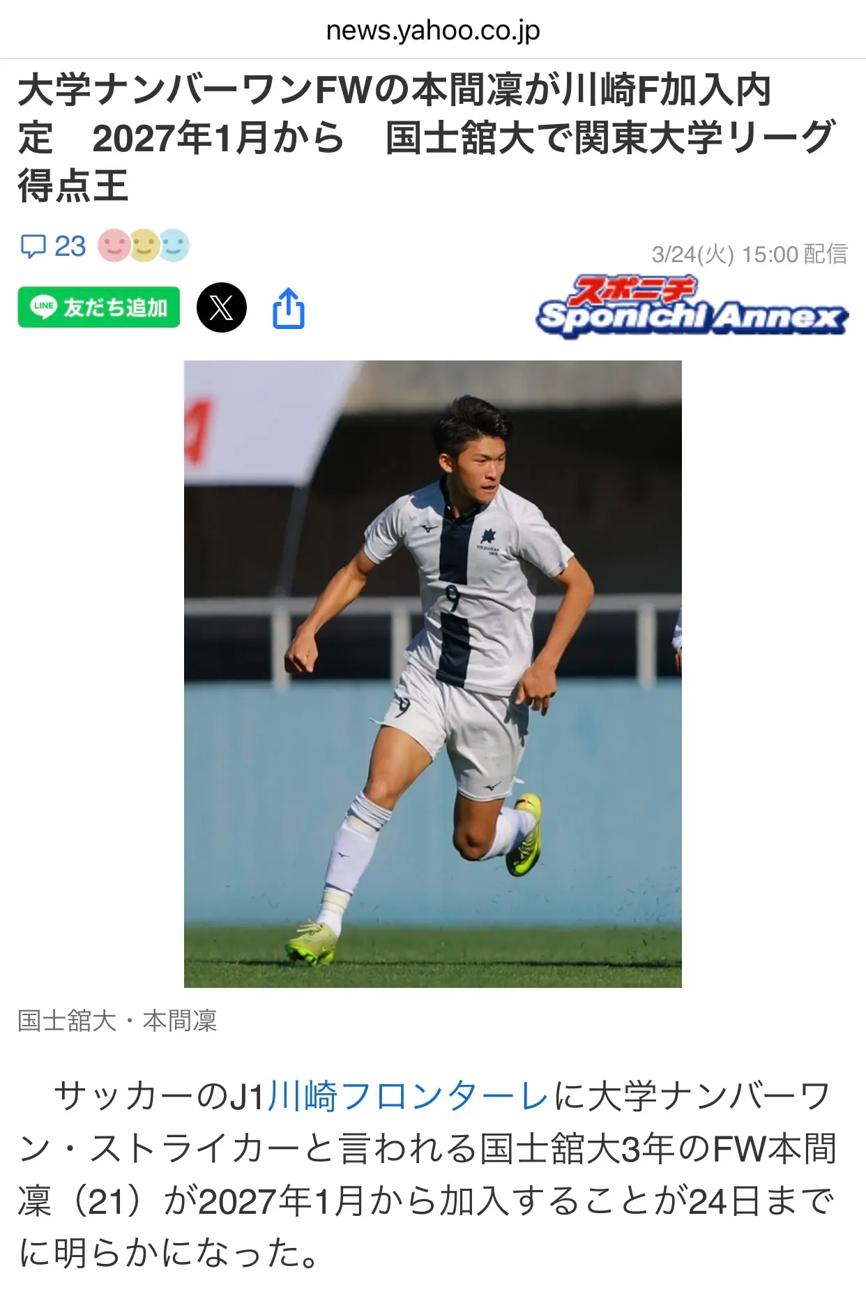 大学No.1ストライカーの本間凜選手(国士舘大学)が、サッカーJ1の名門、川崎フロンターレに加入することが発表されました。2025年度の関東大学リーグで13得点を挙げて得点王に輝き、複数のJリーグクラブが獲得に乗り出していましたが、川崎フロンターレが争奪戦を制しました。こらからの活躍が、たのしみですね。